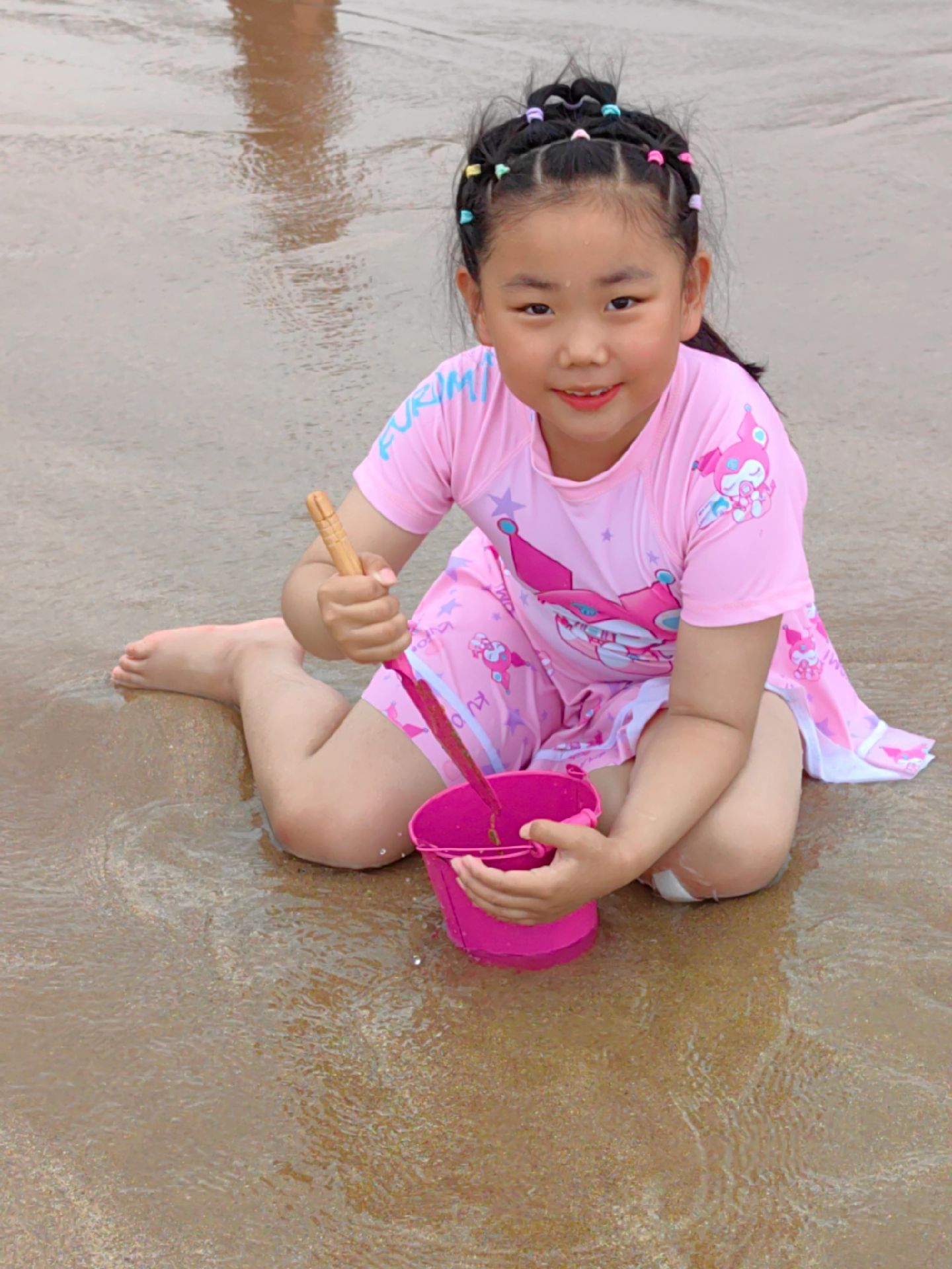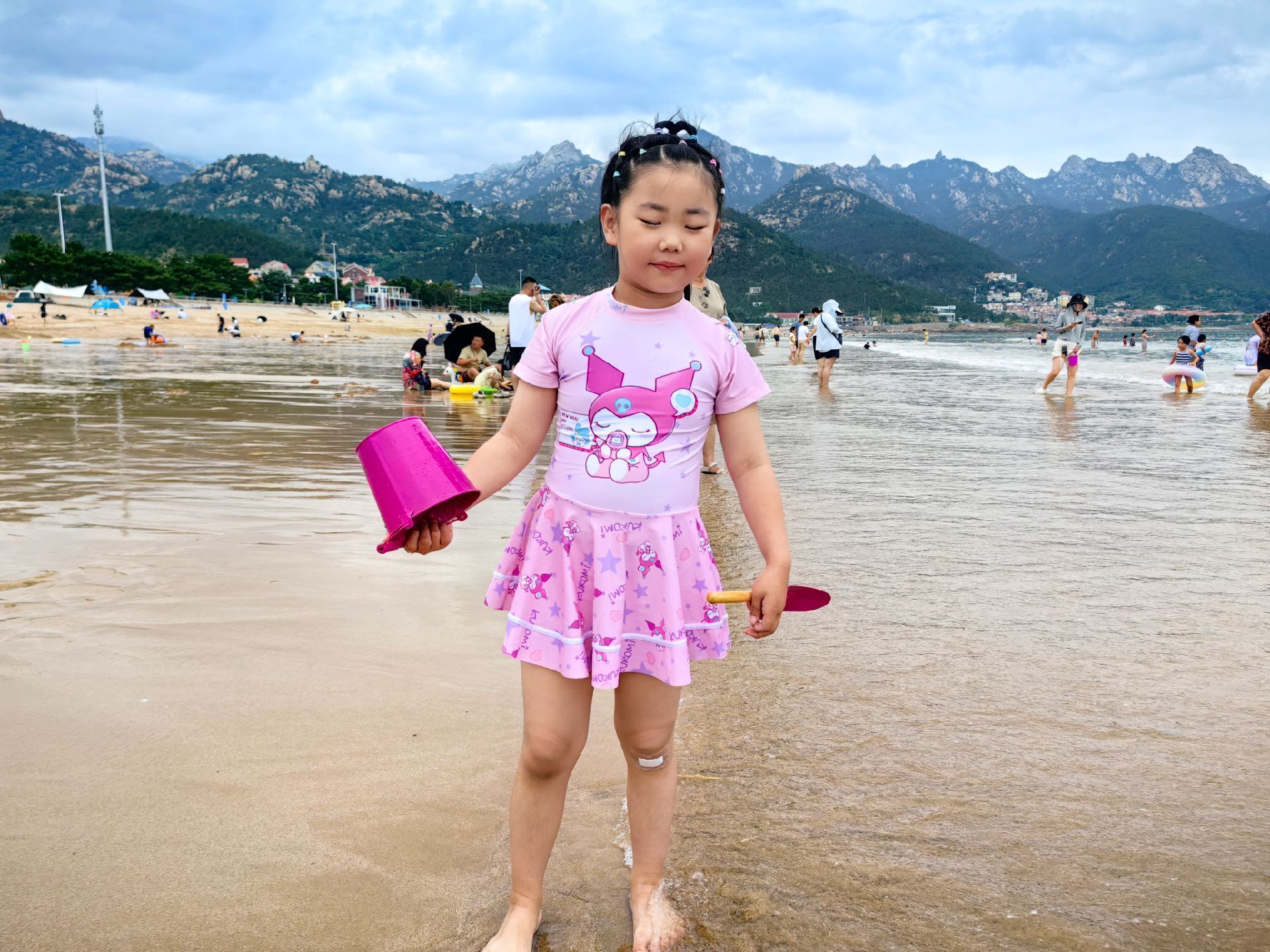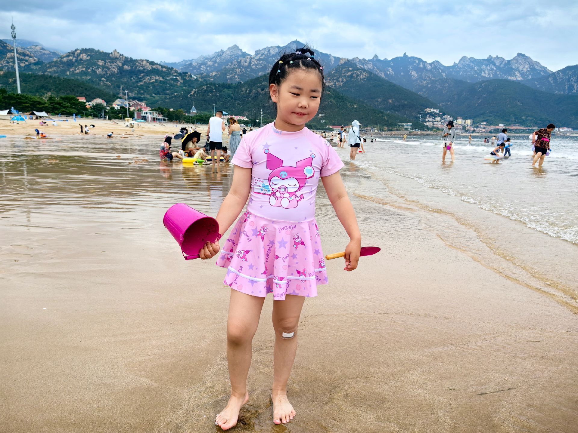 青岛的天气是闷热的,温差很小。你也是第一次经历这样的高温天气。在四天的时间里,你的姐姐为我们的到来做了精心的安排。我们品尝了青岛的美食,喝了正宗的青岛啤酒;游览了八大关,感受了人山人海的栈桥;去了海底世界,在方特游玩;登上了海上第一仙山-崂山。但对于你来说,最开心的就是在海边快乐的挖沙子,拣贝壳;这是你第一次接触和感受大海,你非常的兴奋,带上游泳圈,和大海进行了亲密接触,在海浪的拍打中尽情嬉戏,那一刻,我们都好像是大海的孩子。