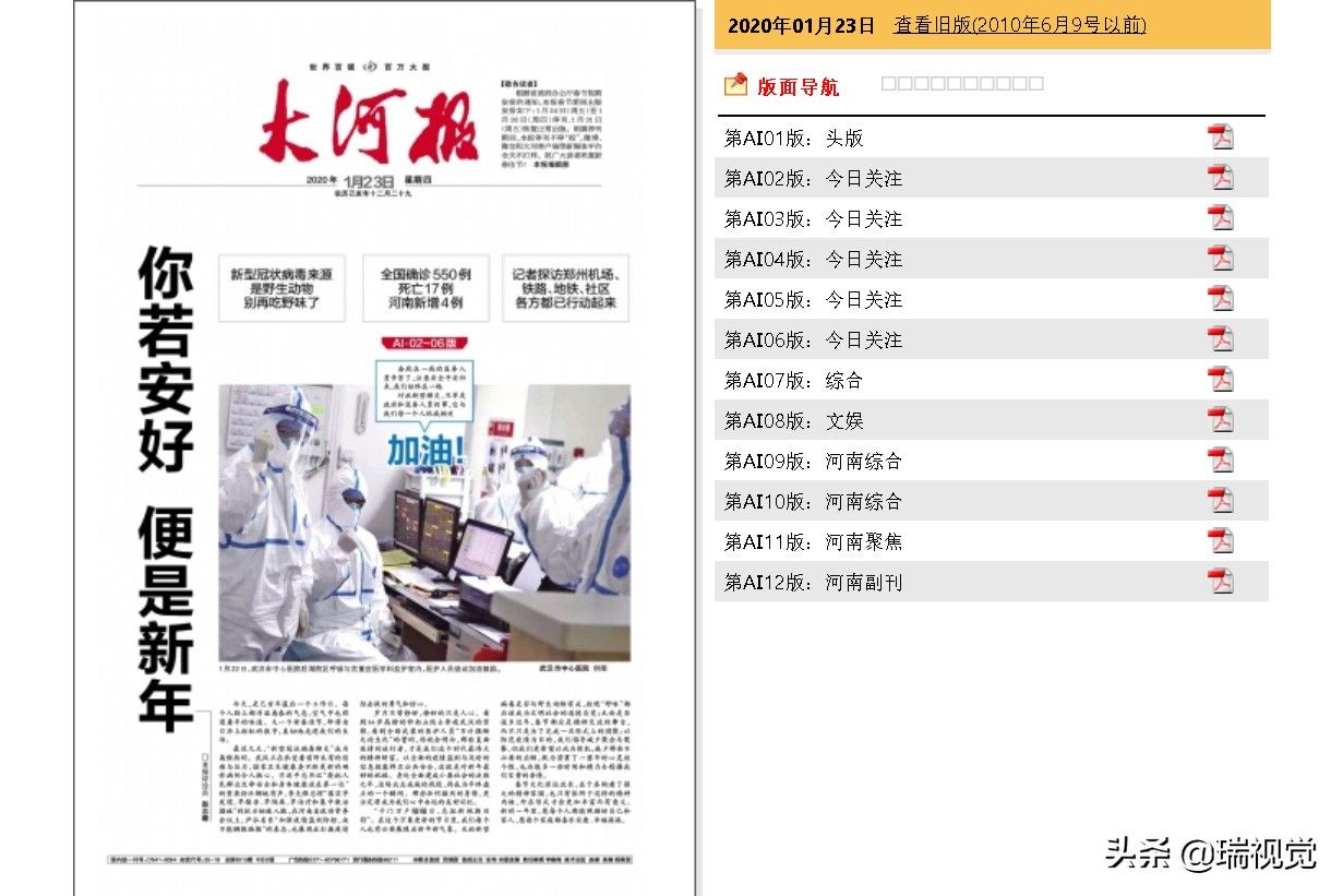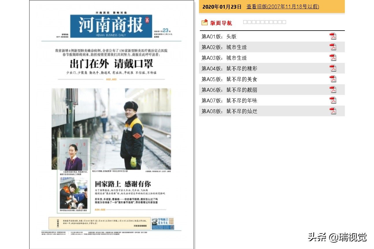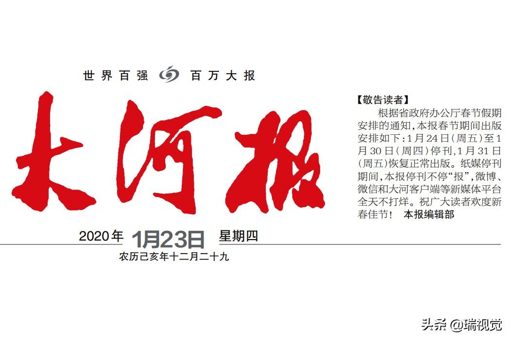 【河南《大河报》《河南商报》等4家报纸:春节前按下暂停键,春节后没再印刷】成立于2000年7月的河南日报报业集团,是以《河南日报》为旗帜和核心组建的现代化传媒集团,是河南省最大的传媒集团之一。集团以十一报两刊三网站为主体,初步形成了涵盖纸质媒体、网络媒体、移动媒体、户外媒体的现代传播体系。河南日报报业集团主要包括《河南日报》《河南日报(农村版)》《大河报》《大河文摘报》《大河健康报》《大河美术》《河南商报》《河南法制报》《期货日报》《今日消费》《河南手机报》《漫画》月刊《新闻爱好者》杂志、大河网、大豫网、河南一百度,以及多家自办或合办的报刊附属网站、电子商务网站等。1月23日(腊月廿九)《大河报》报眼位置的《敬告读者》:根据省政府办公厅春节假期安排的通知,本报春节期间出版安排如下:1月24日(周五)至1月30日(周四)停刊,1月31日(周五)恢复正常出版。纸媒停刊期间,本报停刊不停“报”,微博、微信和大河客户端等新媒体平台全天不打烊。然而,大河网上的《大河报》以及同属河南日报报业集团《河南商报》《今日消费》《大河健康报》的电子版,仍是春节前的最后一期,春节后没有再更新。今天傍晚,给大河报发行服务热线96211打电话,接线员说春节后报纸的计划出版日期几次调整,现在仍没有准确的开始出版日期;不过编辑记者并没有闲着,报纸的APP正常运行,及时给读者提供丰富的精神食粮。