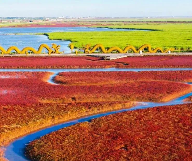 - 红海滩栈道:不是盘锦!4月底碱蓬草初红,无人机航拍蜿蜒入海的红色“血管”。