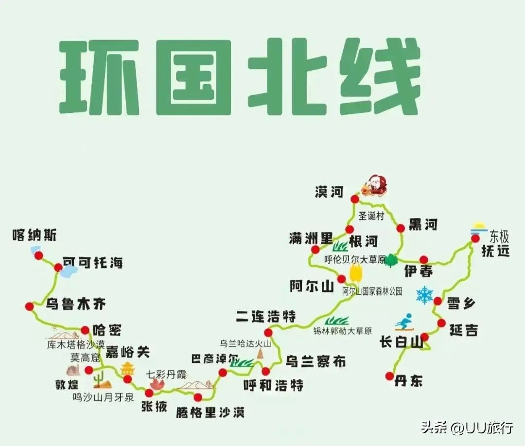 锡林郭勒公园、二连浩特国门、恐龙地质公园、额济纳胡杨林、哈密回王陵和魔鬼城、江布拉克、可可托海、额尔齐斯大峡谷、五彩滩、喀纳斯、禾木村和白哈巴村等。