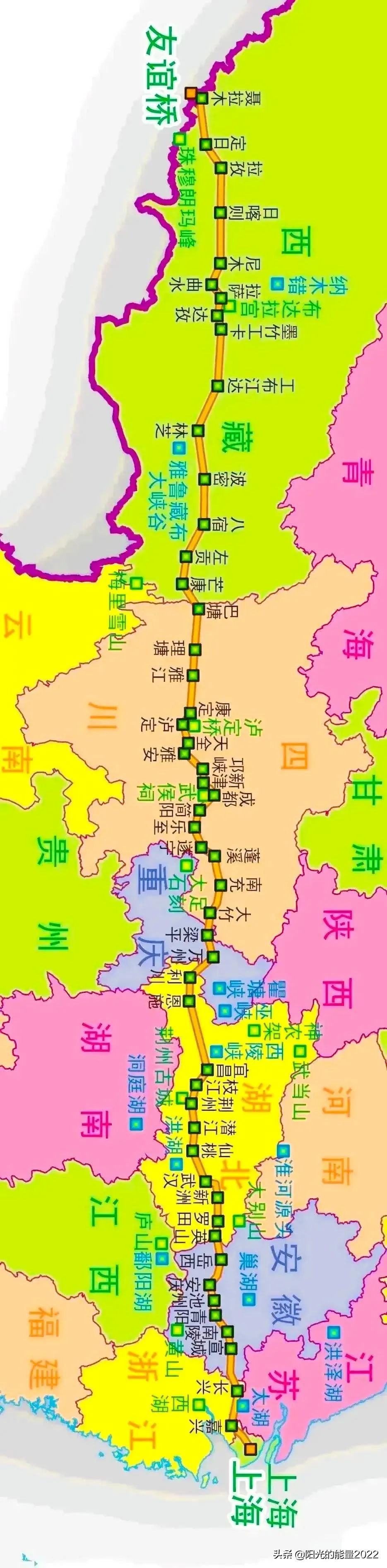 贯通东西,途经上海、江苏、浙江、安徽、湖北、重庆、四川、西藏等八省市