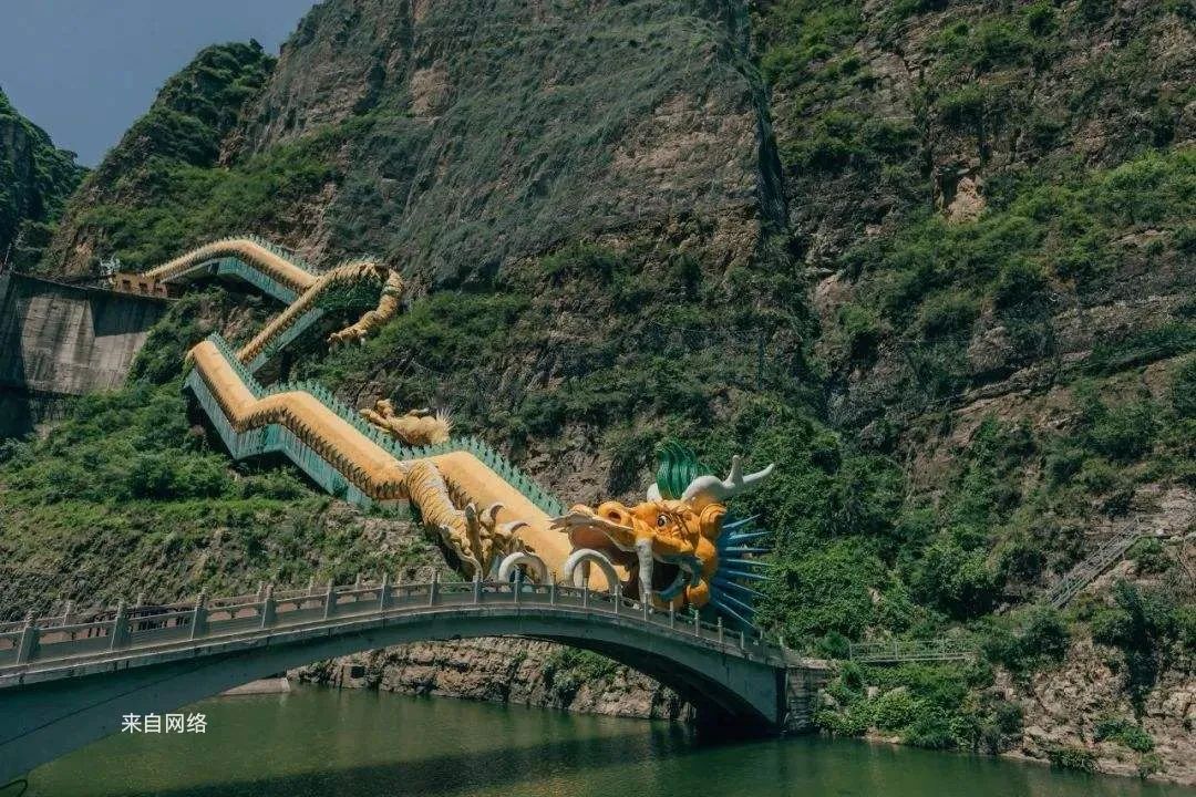 走进景区大门,迎面就是一条头下尾上的巨龙,大张着的龙嘴原来是上山的入口,里面藏着几段电动扶梯,游人便可轻松地爬上72米高的水库坝顶。大坝横跨在两山之间,犹如一位大力士弓腰曲背挡住了滚滚河水的去路,堰塞出一弯碧湖。站在其上,左侧是令人目眩的水泥崖壁,右边为碧波荡漾的湖面,人们即会有种飘然若仙的感觉了。