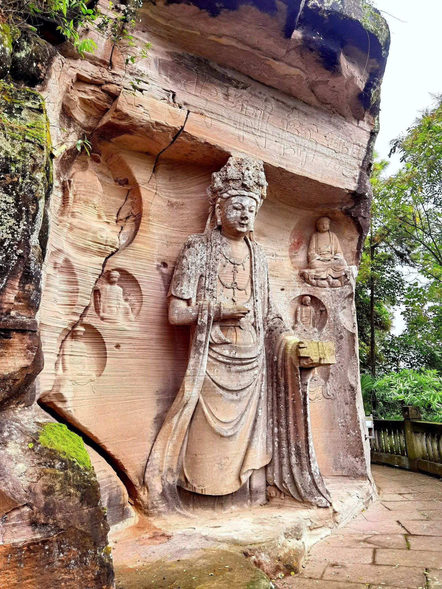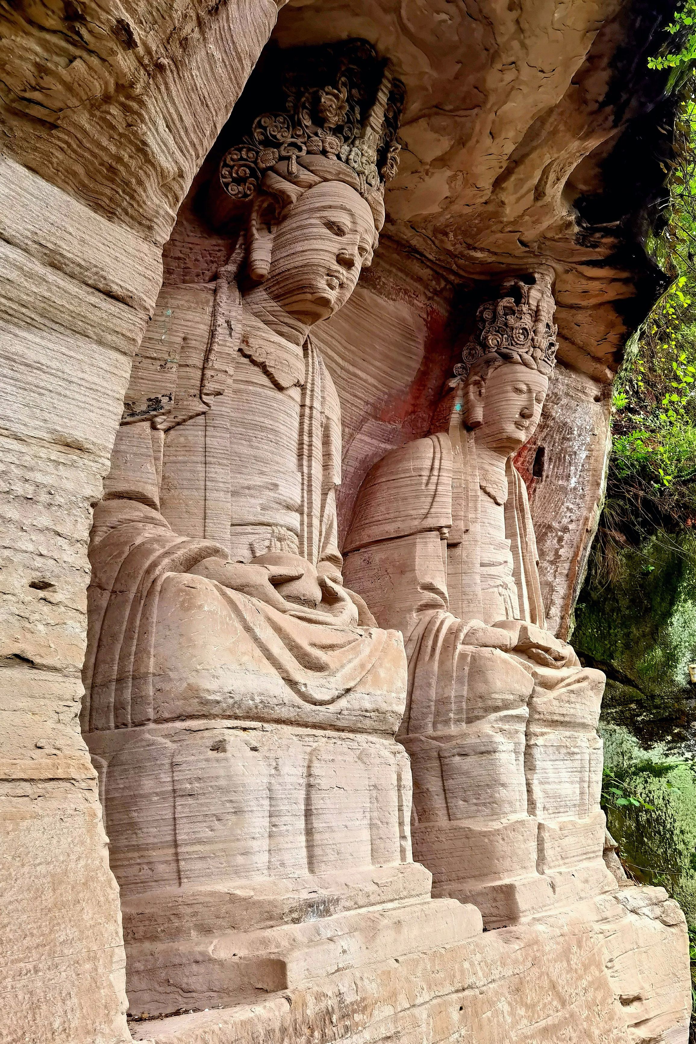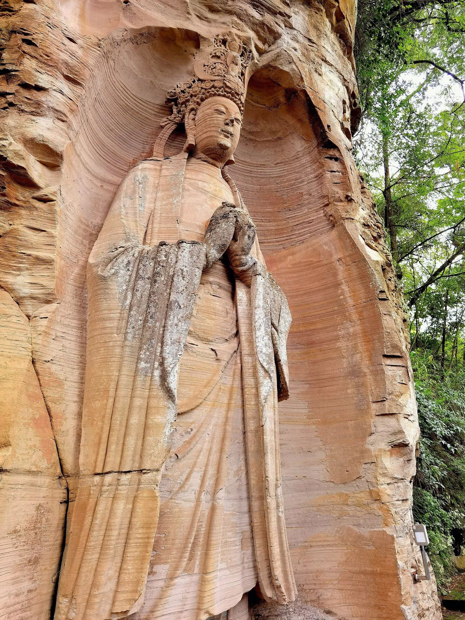 关于茗山寺,在清代道光濮瑷版《安岳县志》中,仅有一句"佛像森列,周缀于绝壁之上"的记载。现存两宋时期石刻造像63尊,绝大部分除自然风蚀外均保存完好。