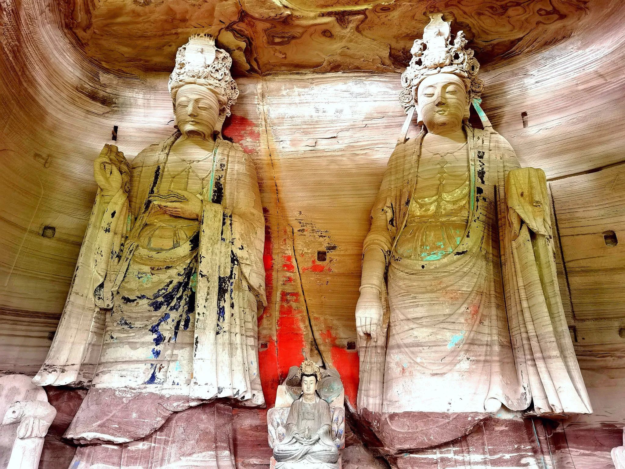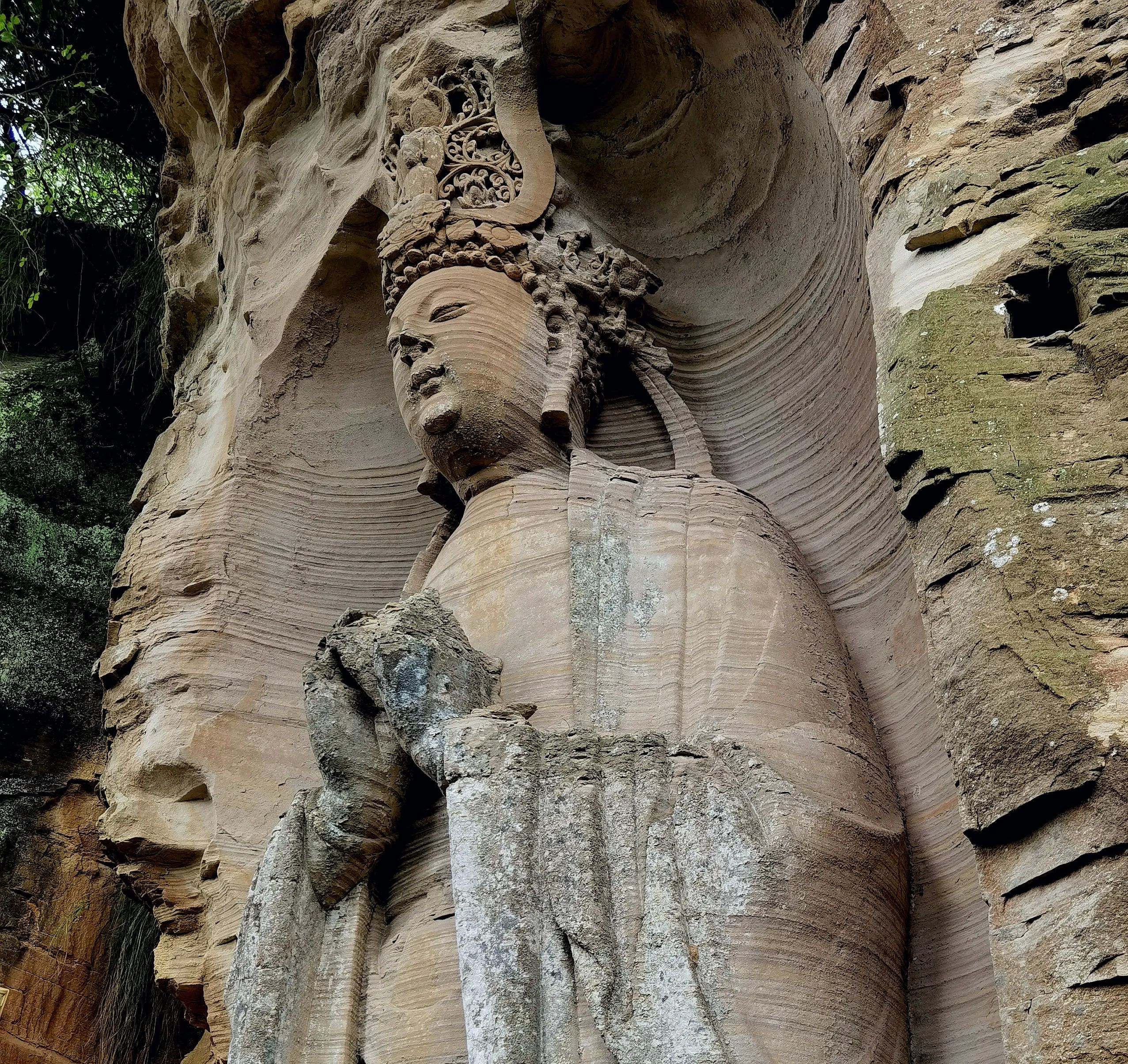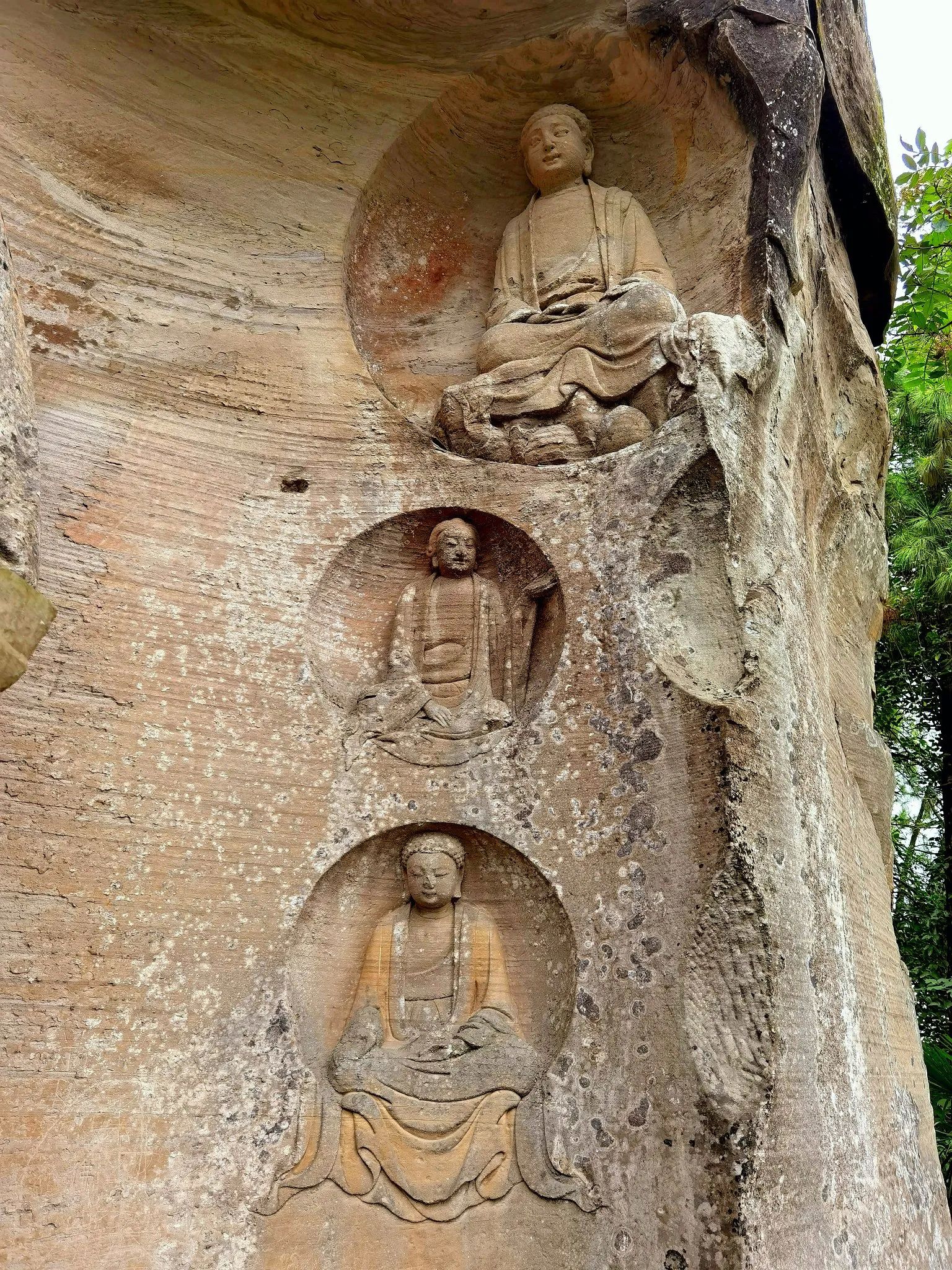 关于茗山寺,在清代道光濮瑷版《安岳县志》中,仅有一句"佛像森列,周缀于绝壁之上"的记载。现存两宋时期石刻造像63尊,绝大部分除自然风蚀外均保存完好。