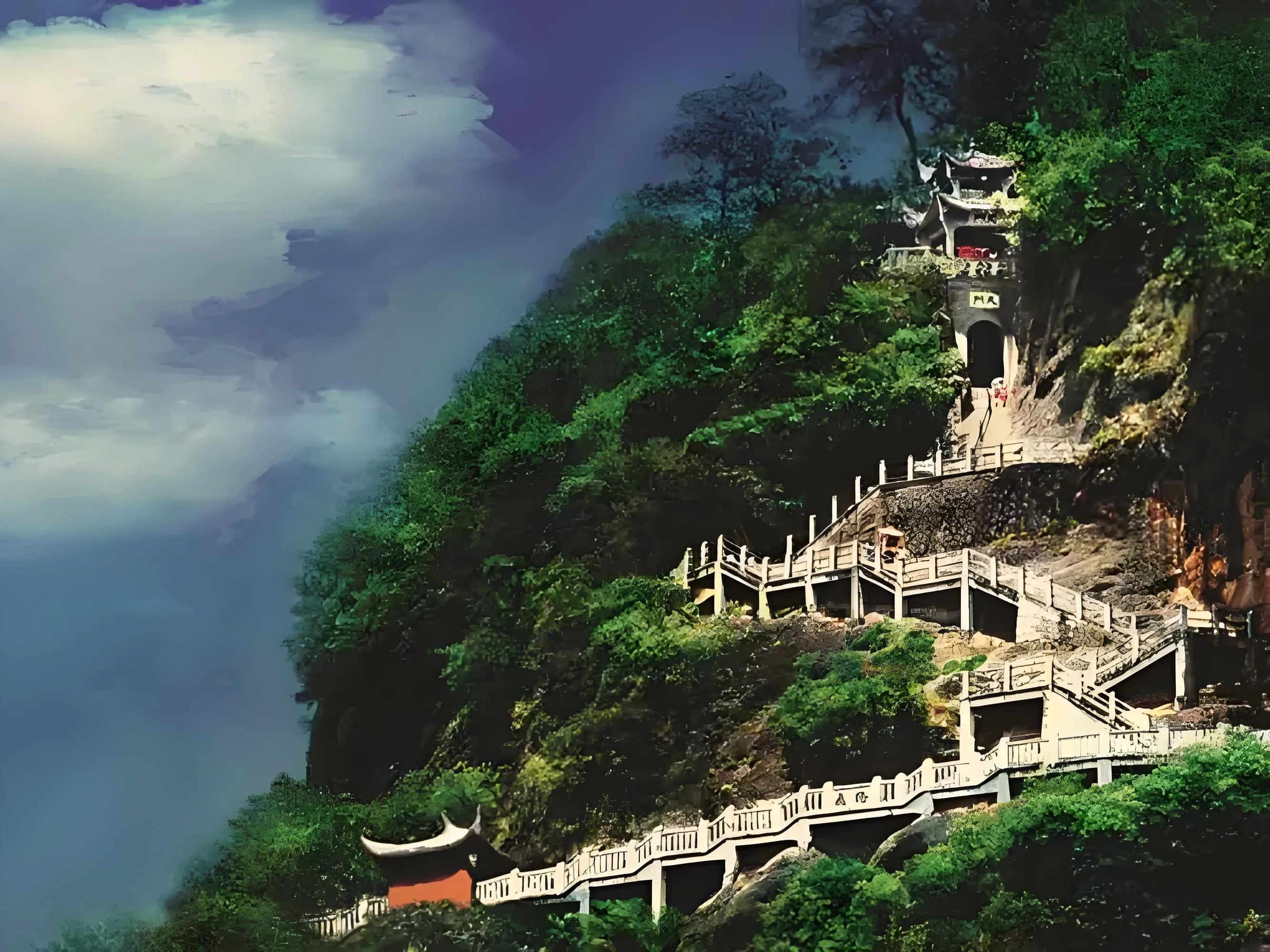 - 方岩山:这是景区的核心景观,以雄奇峻险著称,是丹霞地貌特征最明显、发育最完全的区域。从入口处的石碑开始,沿着山路向上,会经过罗汉洞、虎跑泉、百步峻、飞桥栈道等景点。沿途可领略方岩层层褶皱的峻峭山体和远处山顶的祠宇、岩壁上曲折向上的台阶。到达山顶后能俯瞰周围壮丽的景色。