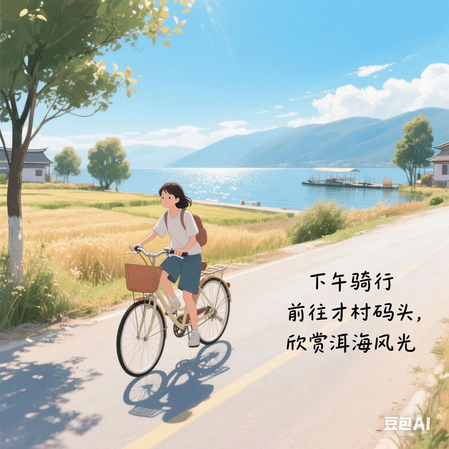 - 下午:在古城周边租一辆自行车,骑行前往才村码头,欣赏洱海风光。