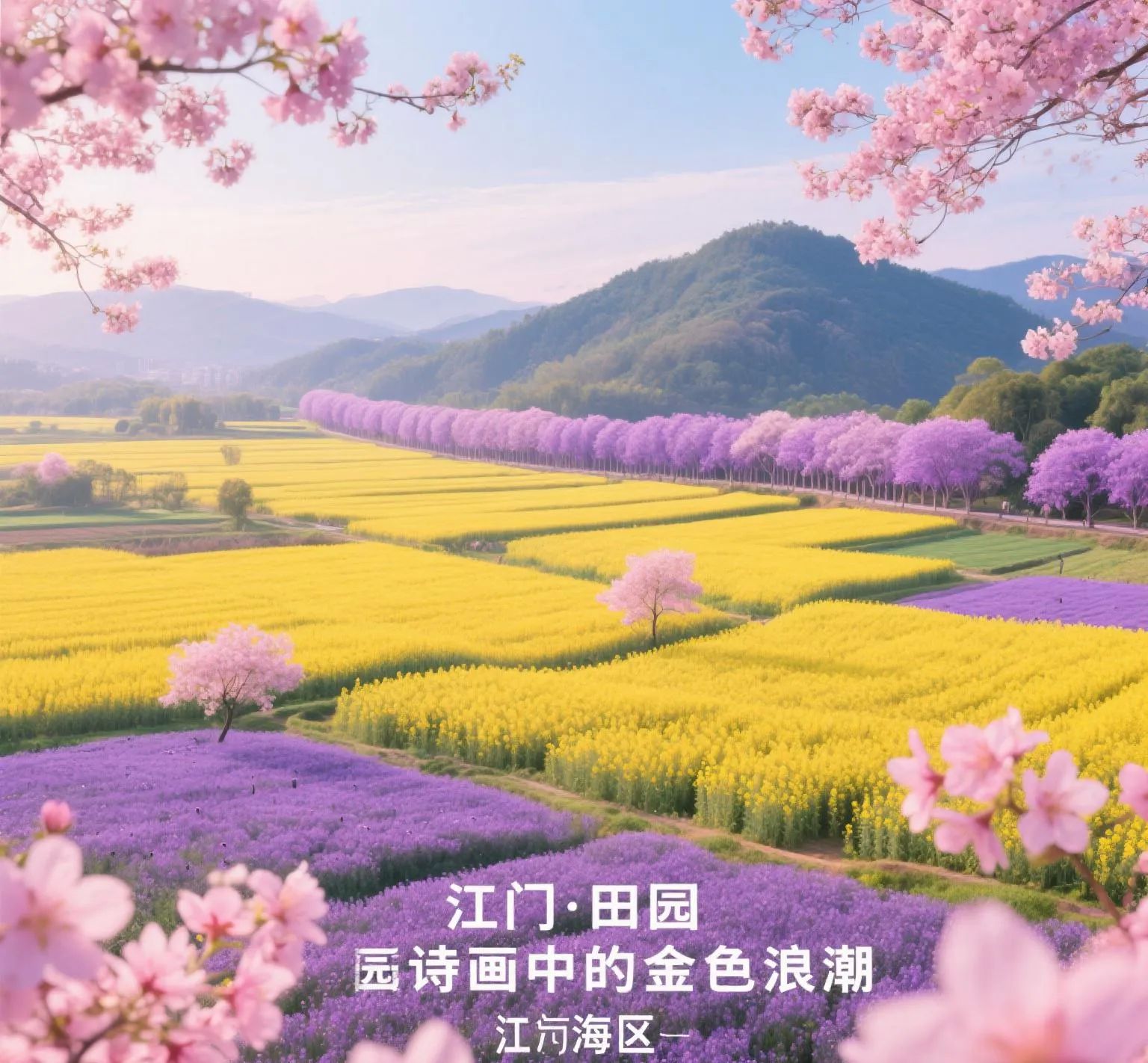 江海区的千亩油菜花海如金色海洋涌动,桃花点缀其间,层次分明。圭峰山的樱花长廊与紫花风铃木交织成粉色梦境,恩平的紫色花海更添神秘,仿佛闯入莫奈的调色盘。