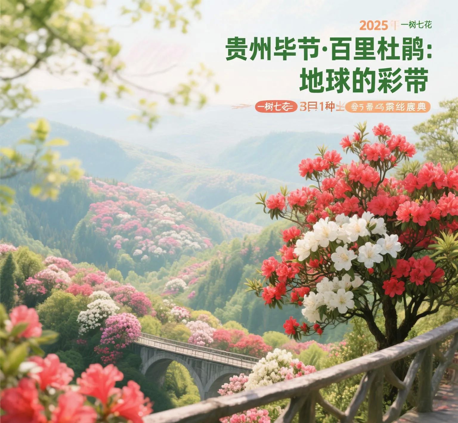 作为全球最大的天然杜鹃花园,毕节百里杜鹃在3月至5月化身为“地球彩带”,41个品种的杜鹃绵延50余公里,马缨杜鹃红似烈焰,露珠杜鹃皎洁如雪,更有“一树七花”的奇观震撼视觉。漫步金坡景区的索玛花桥,俯瞰漫山遍野的绚烂,仿佛坠入油画世界。