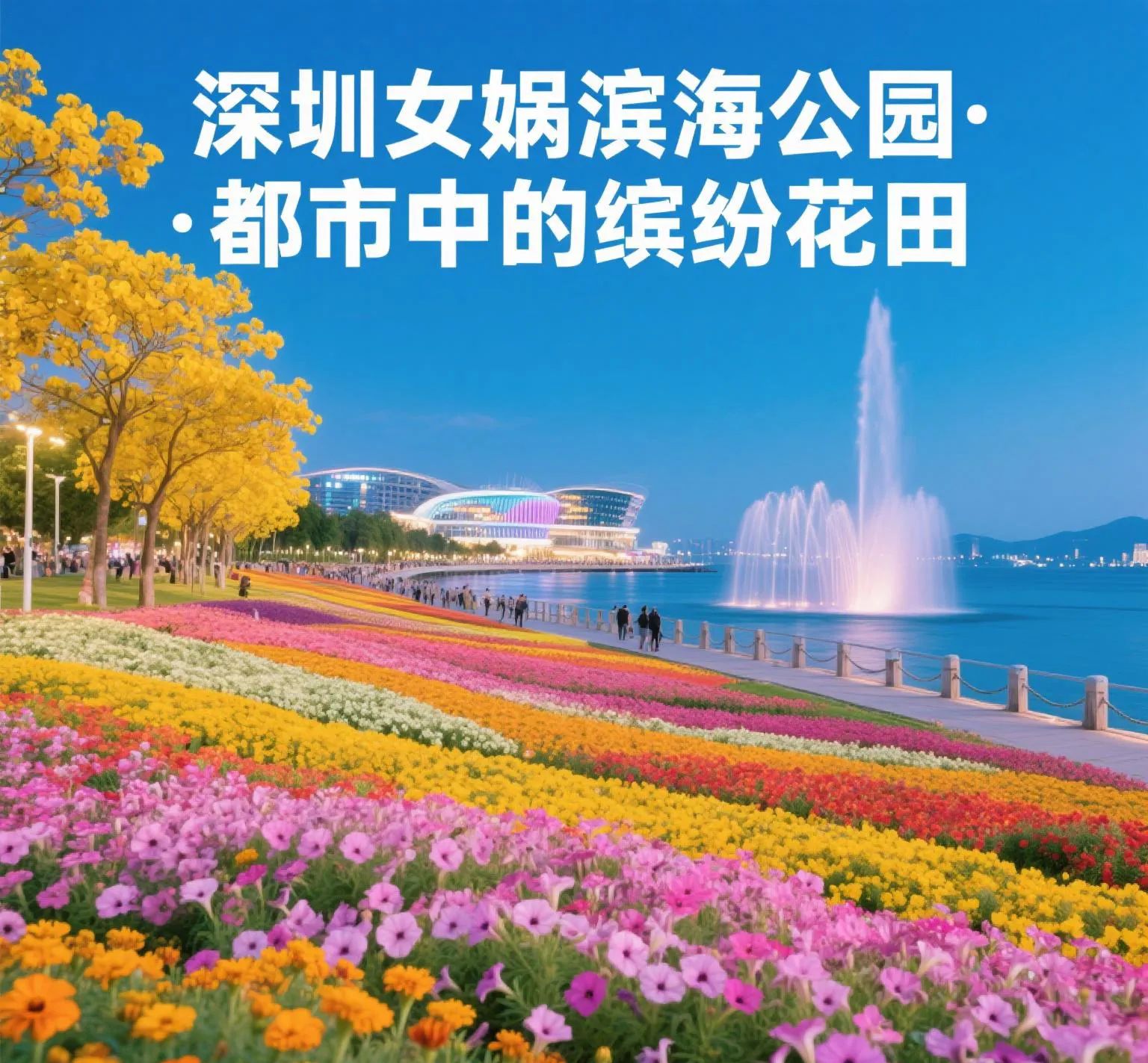 3. 深圳女娲滨海公园·都市中的缤纷花田无需远行,深圳湾畔的免费花海同样惊艳。万寿菊与矮牵牛编织成五彩地毯,银鳞风铃木满树金黄,海滨栈道延伸向蔚蓝,随手一拍即是春日大片。夜晚还可邂逅海上世界的音乐喷泉,浪漫值拉满。