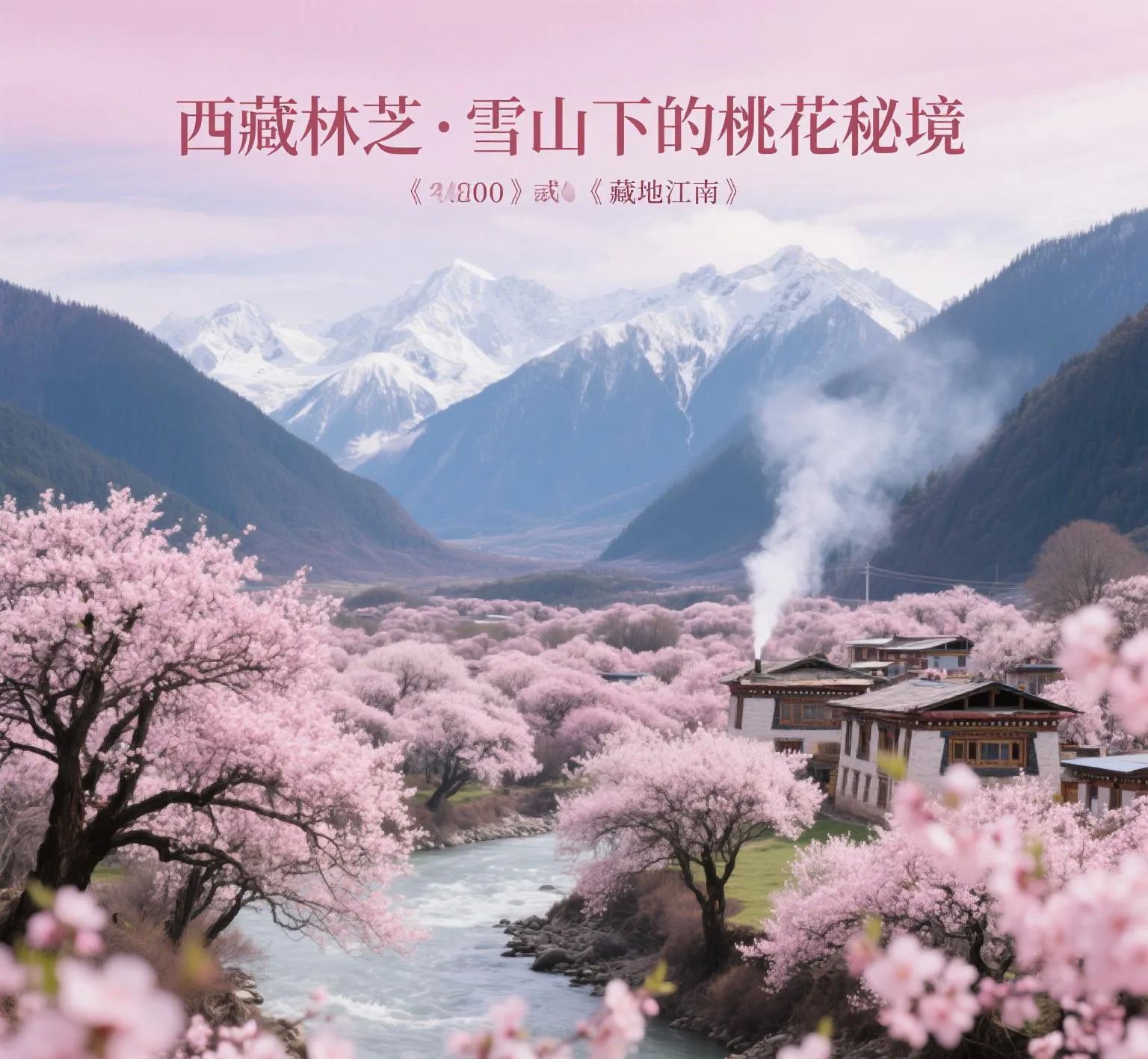 三月的林芝,300万株野桃树在雪山下怒放,粉色花海与南迦巴瓦峰的皑皑白雪交织成“藏地江南”的绝景。波密桃花沟的百年古桃树沿河谷舒展,藏寨炊烟与花影共舞,每一帧都是《诗经》中的桃源画卷。