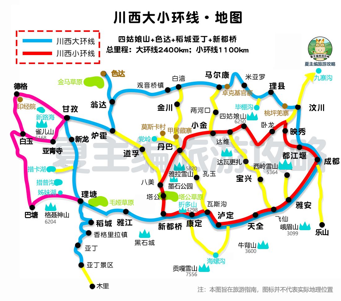 46、川西地图总览:四川西部的公路网、途经城市与旅游景点位置概览。