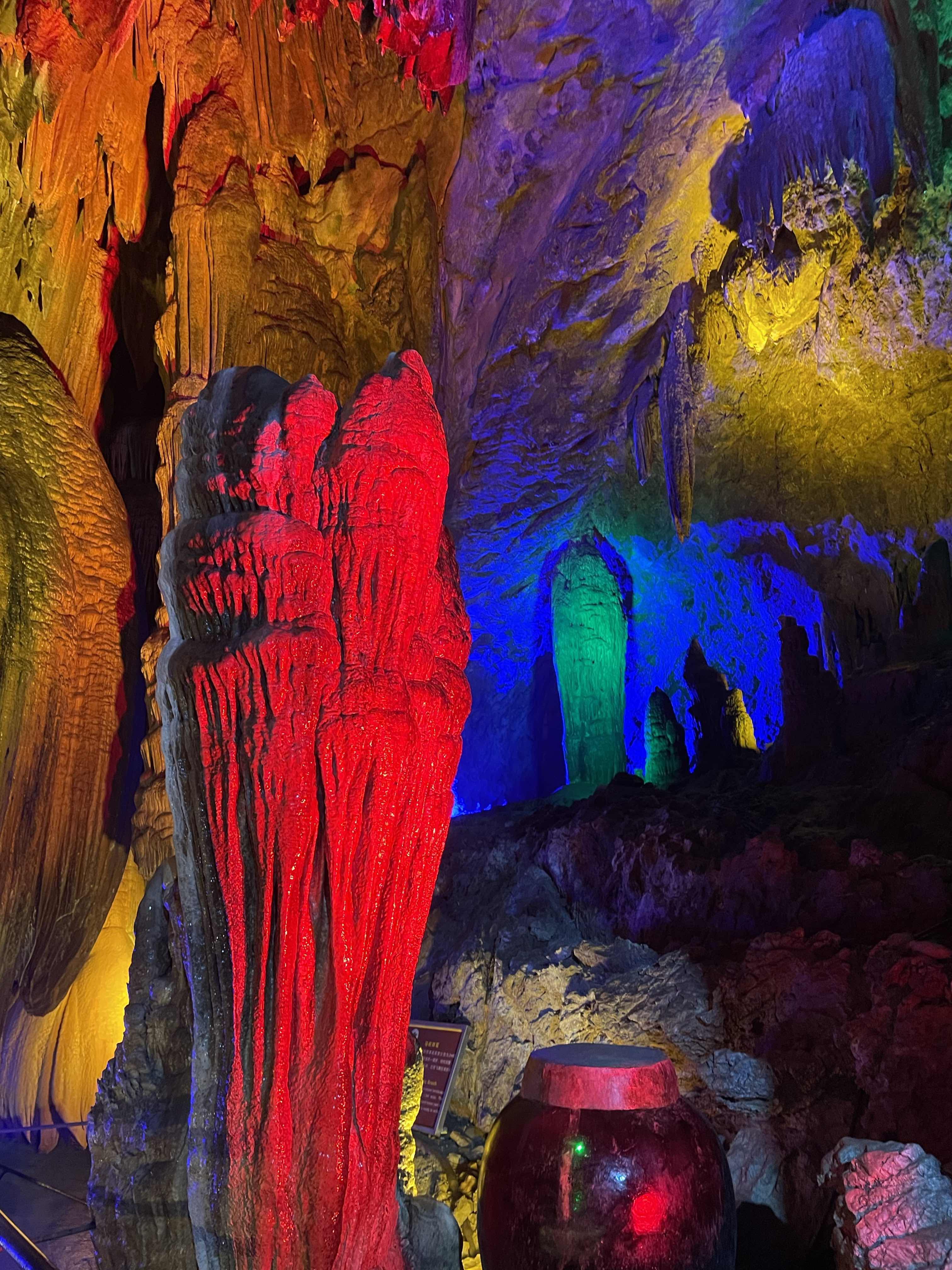 隐水洞全长5180米,分上下两层,洞内钟乳石林立,形态各异,如“鲤鱼跃龙门”“天降神靴”“玉兔观桃”“寒山寺古钟”“水生石莲”等,造型逼真,规模宏大。洞内还有“灯箱走廊”“壁画长廊”等特色景观,流光溢彩,宛如地下仙境。