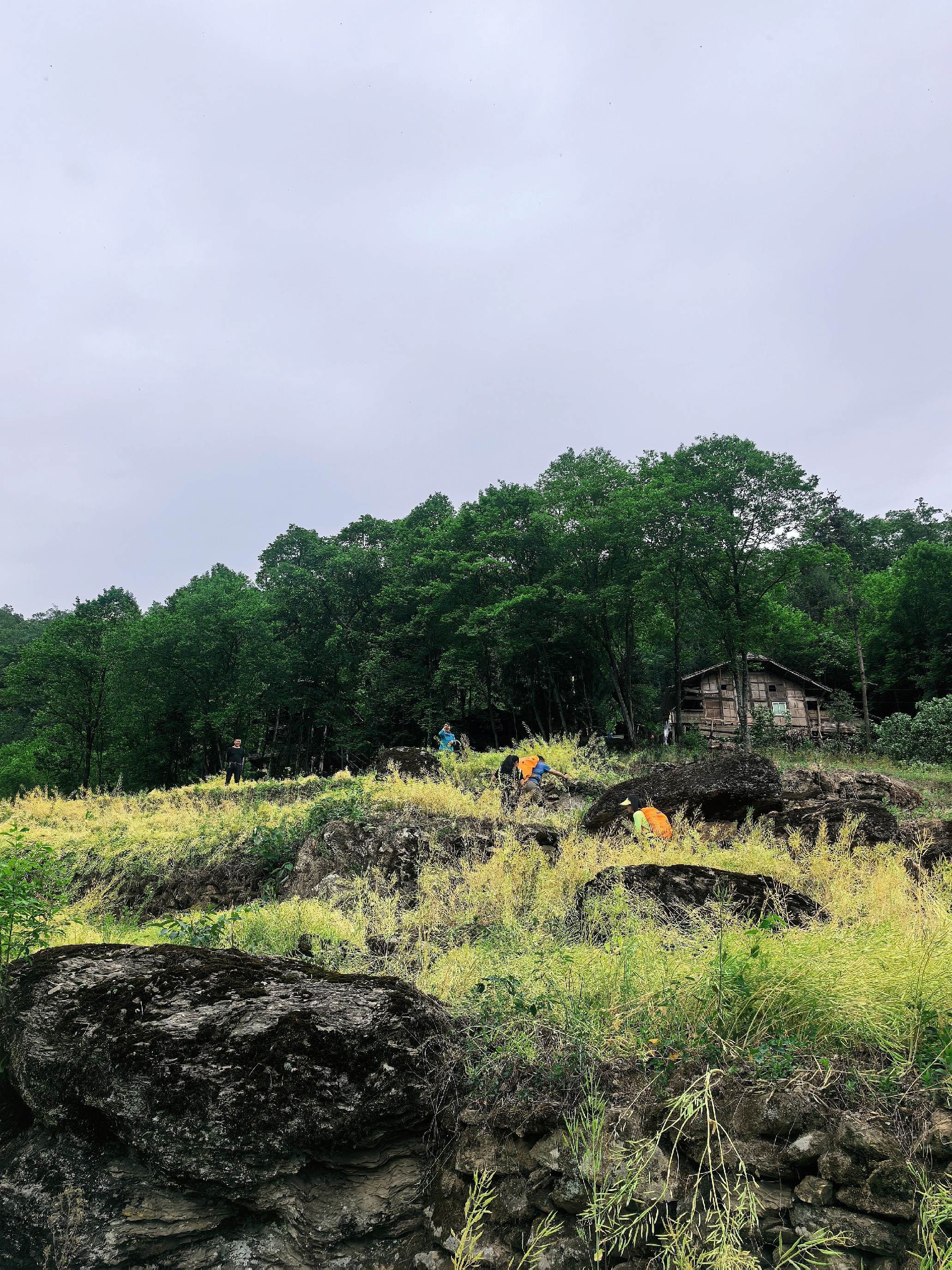继续往上穿树林、牛栏杆、核桃树林,到一座大石头处,真的很有感觉,大家开始疯狂拍起来。