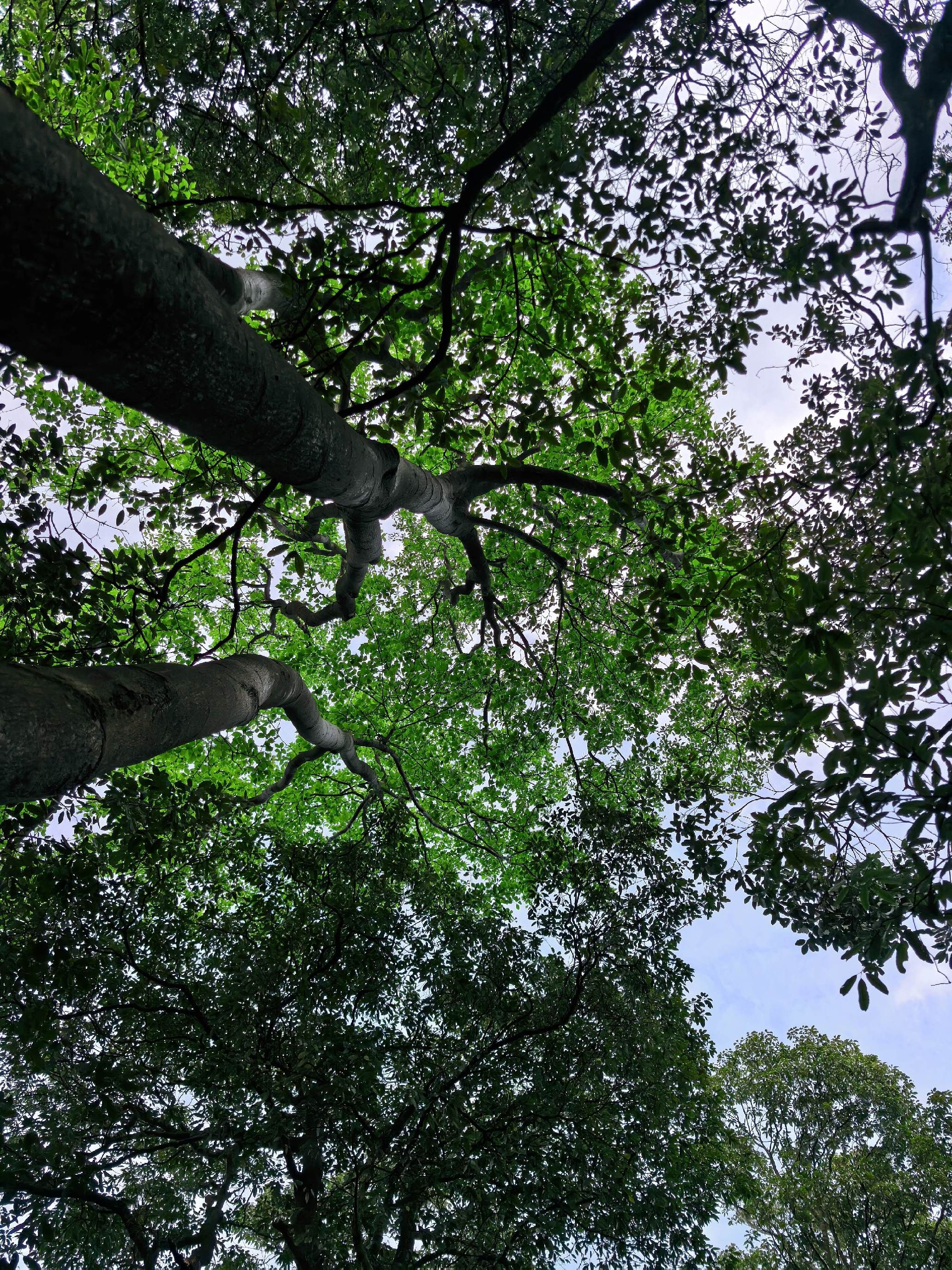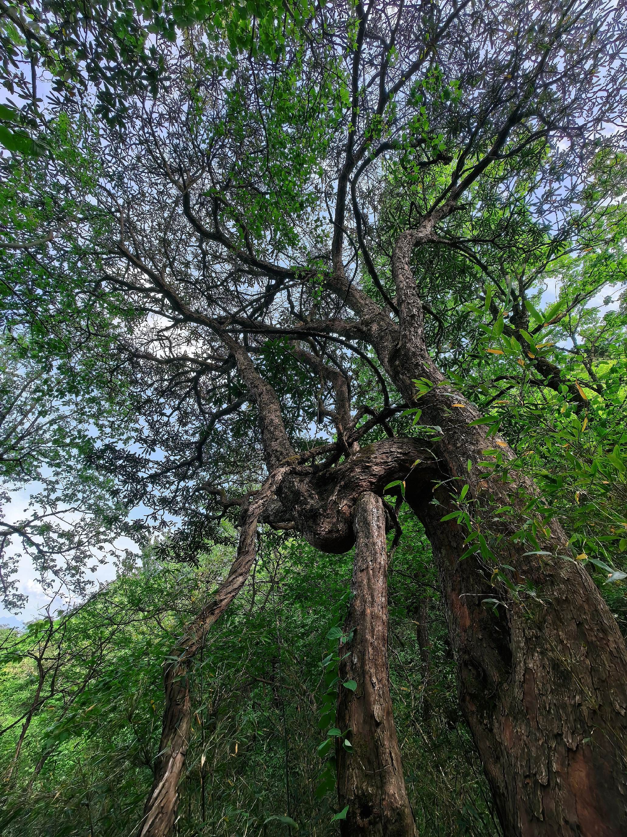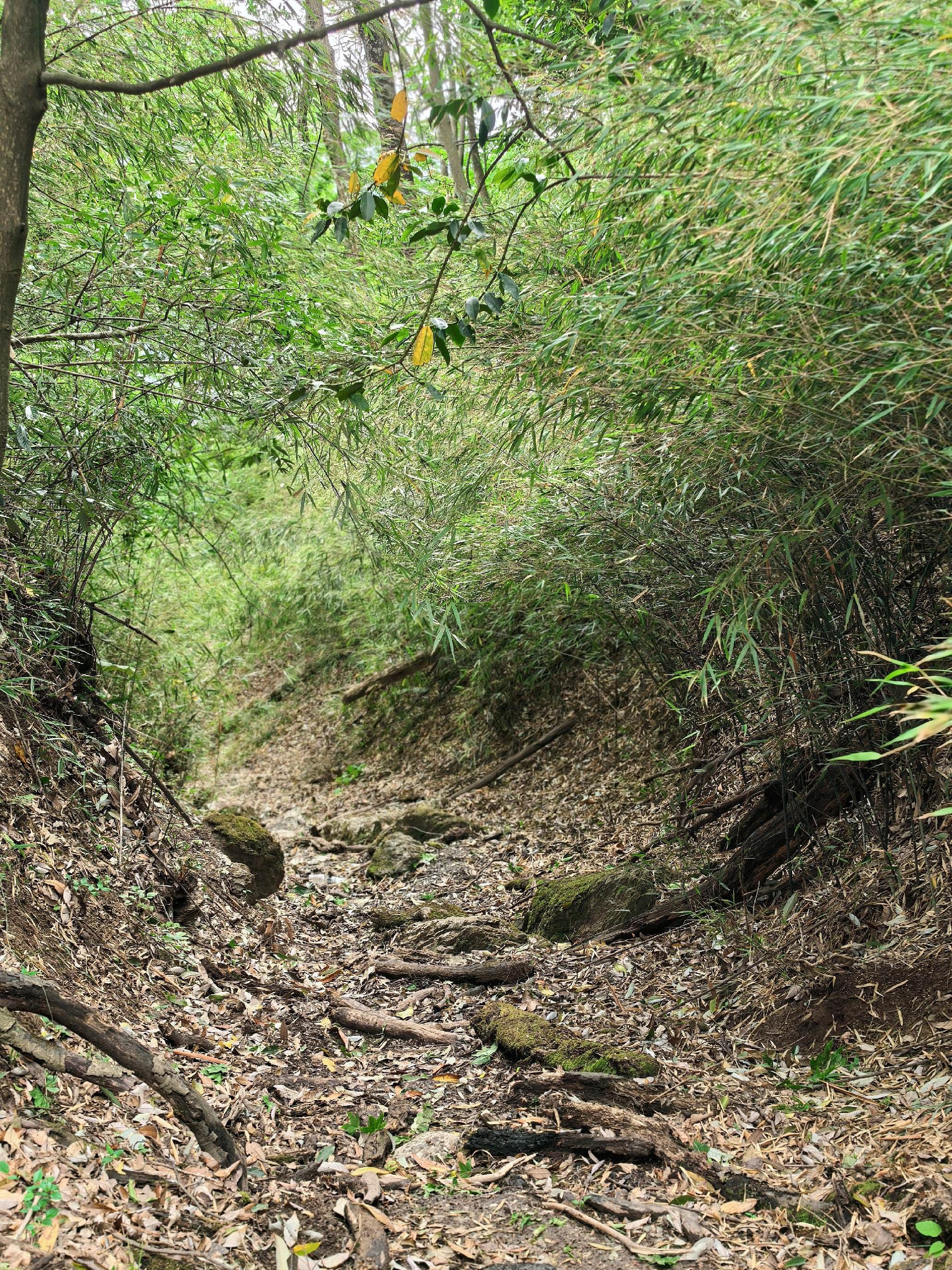 继续穿越树林、竹林,遇见许多杜鹃树,花早已凋落,所幸还有几株紫色杜鹃正开,在树林中是那么耀眼。