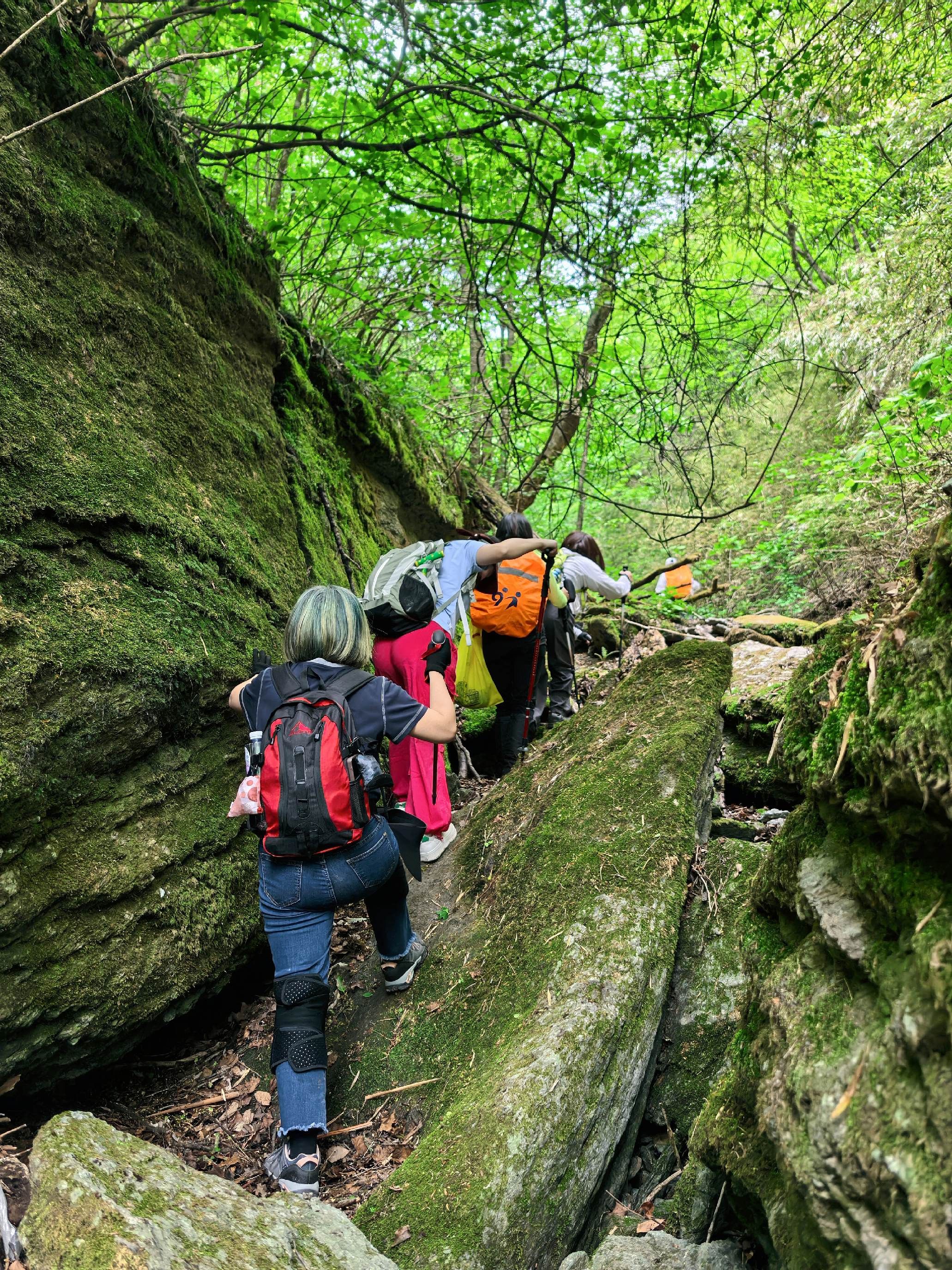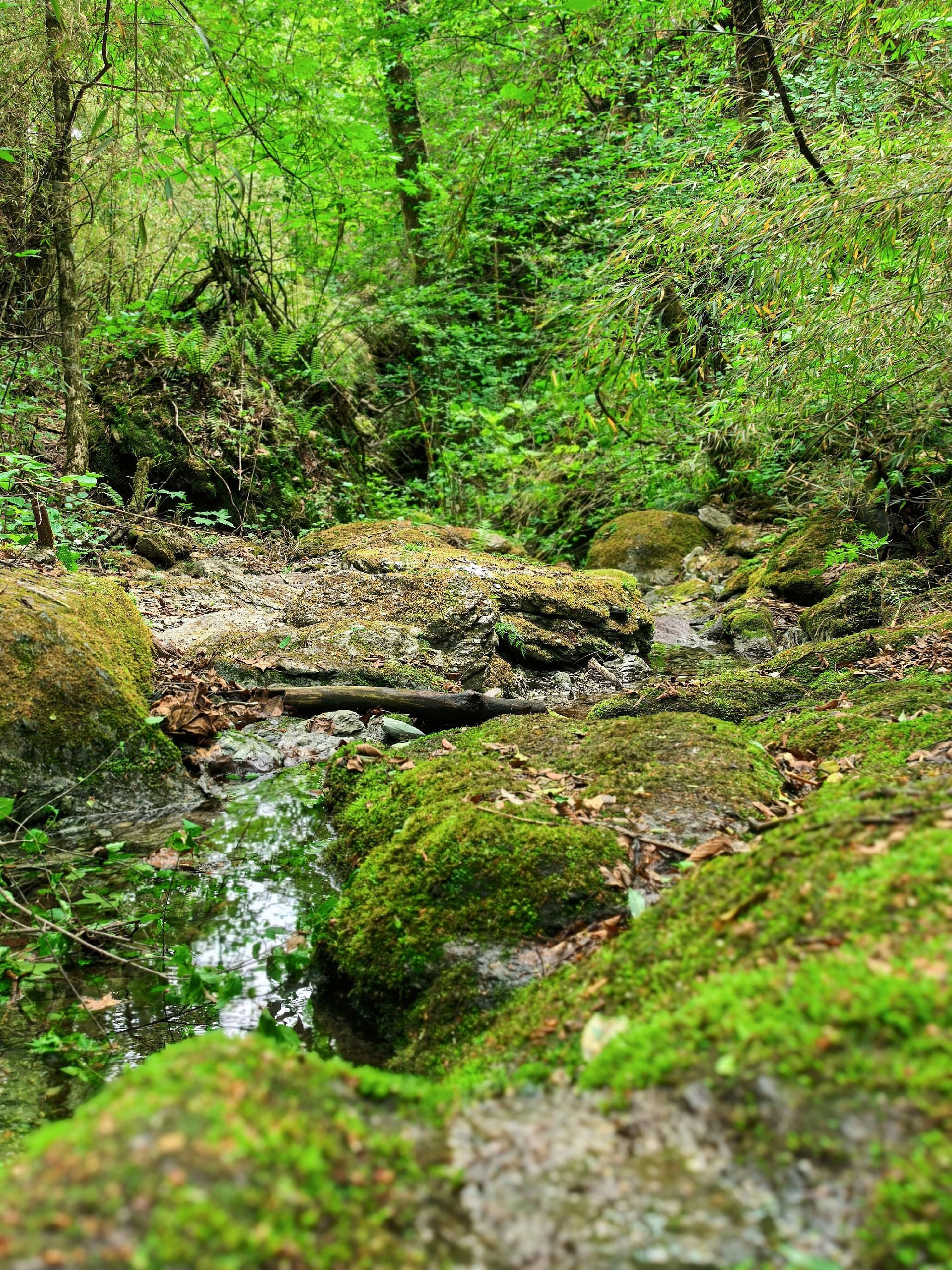 再往上走,溯溪沟而上,在沟里穿梭,翻过岩石,踩过青苔。绿茵的山沟,潺潺而清澈的溪水,仿佛爱丽丝的森林仙境。