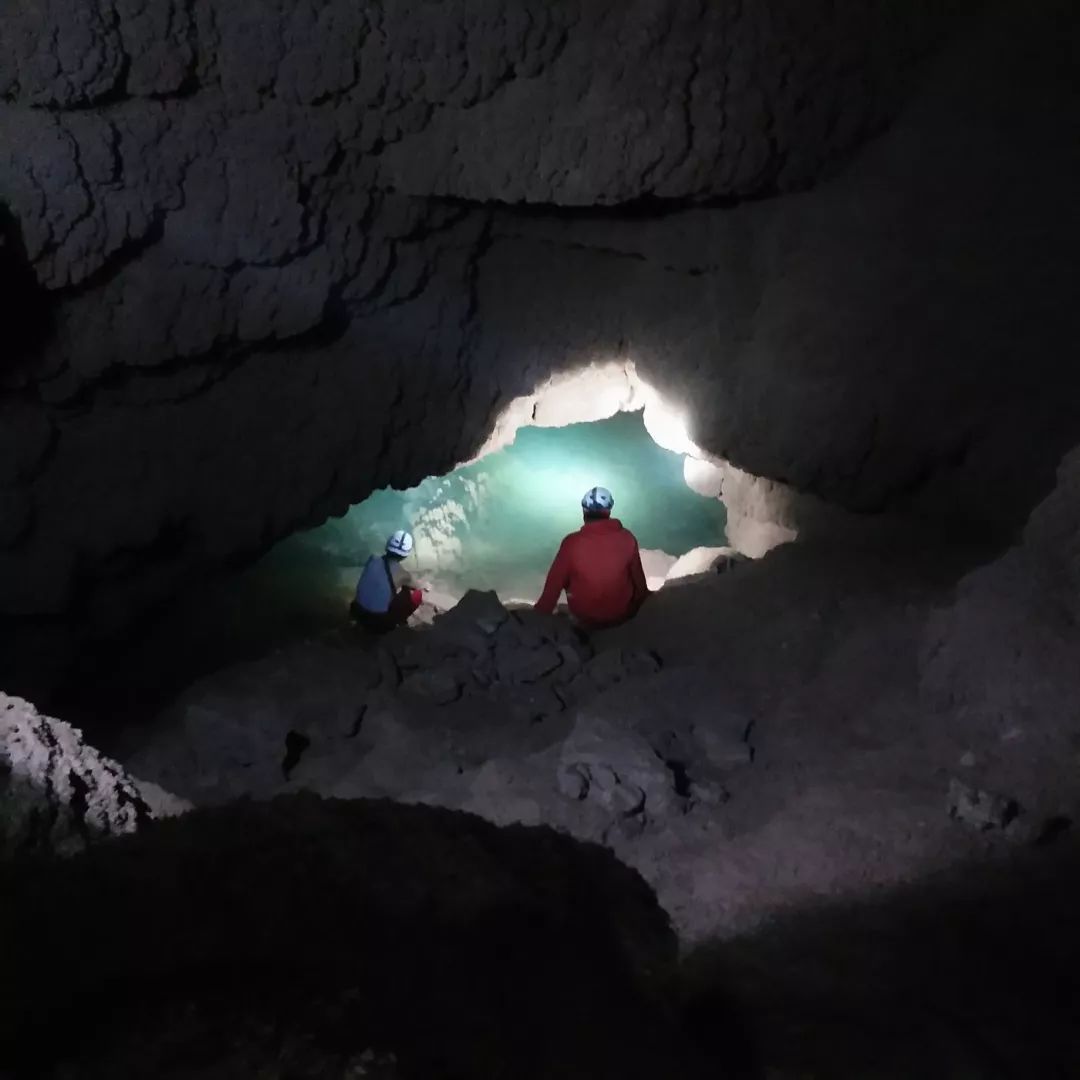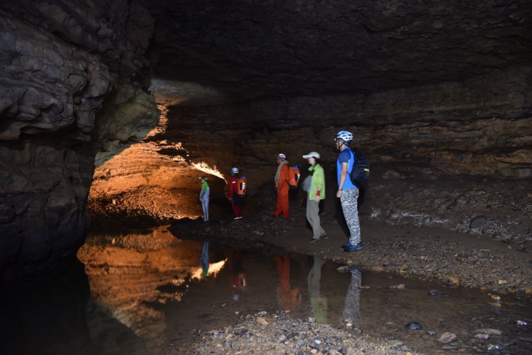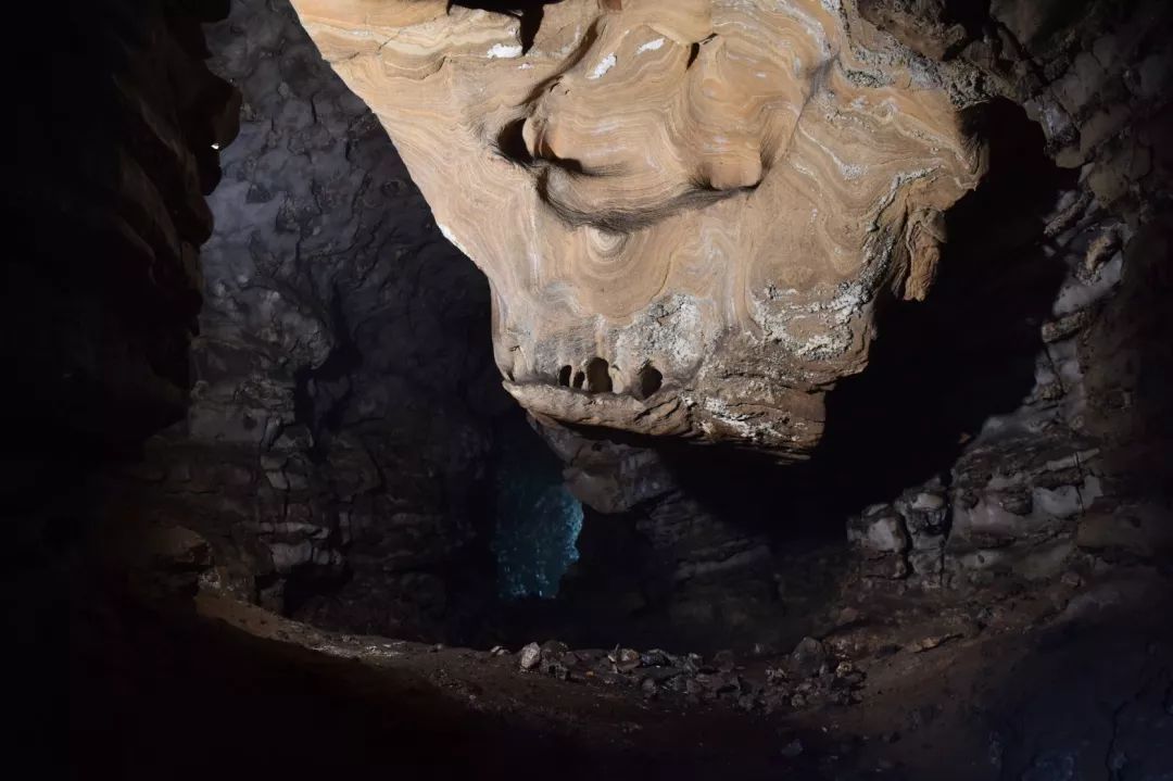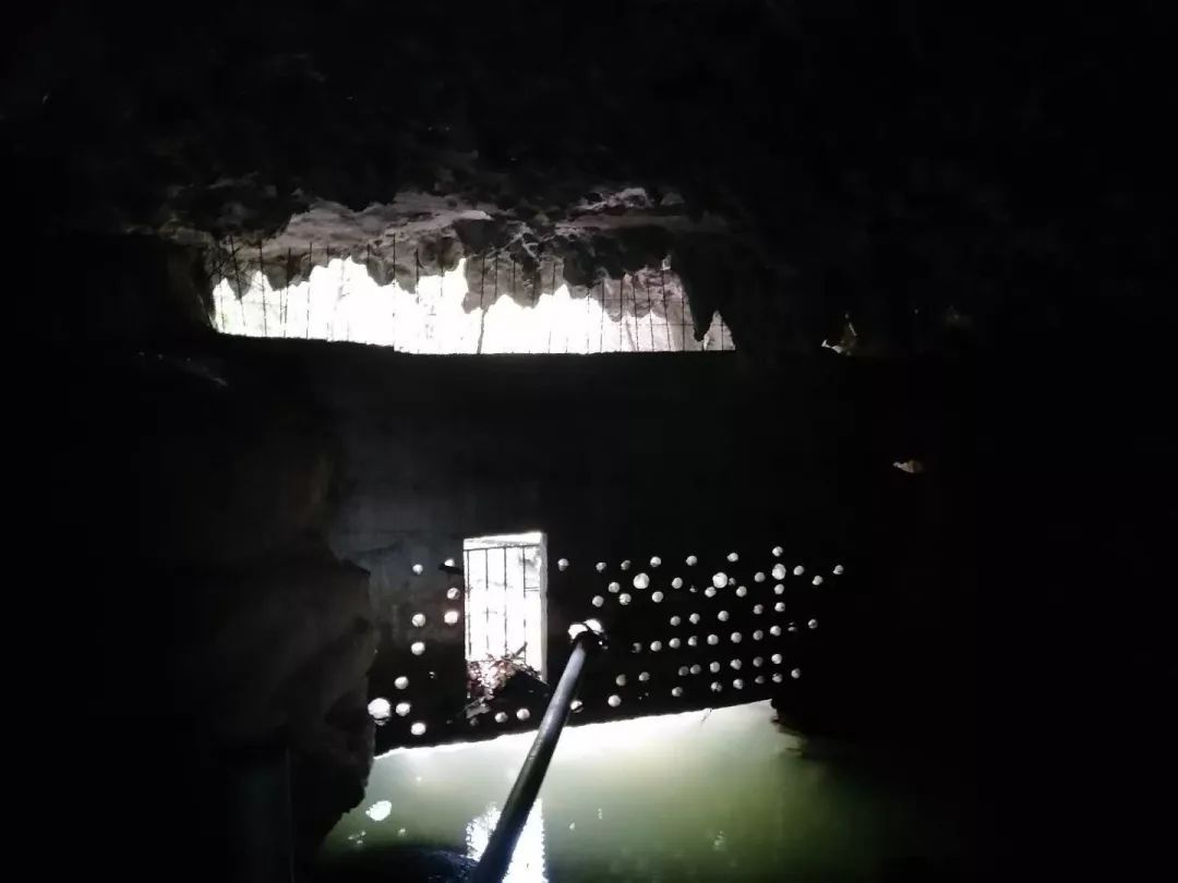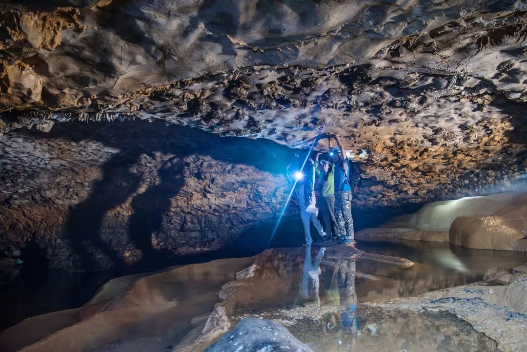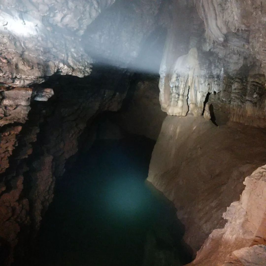 洞道干燥,也没有听见水流的声音,却连续形成几个深潭,在灯光映照下,幽深,谧静,散发着窒息般的蓝调,有种鬼吹灯之精绝古城的现实存在。前面似乎还可以前进,挑战吧,试试在洞中游泳的恐惧刺激……