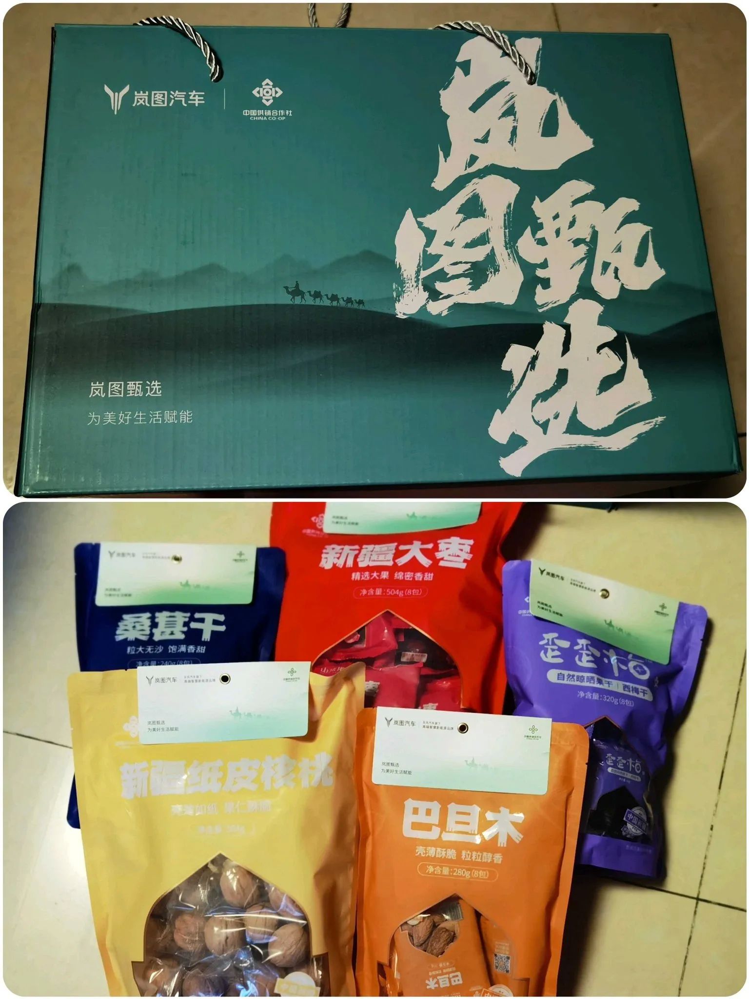 每次郊游出行,我还喜欢带上岚图精选的美食——岚图甄选欢聚礼包,里面全是新疆助农产品。