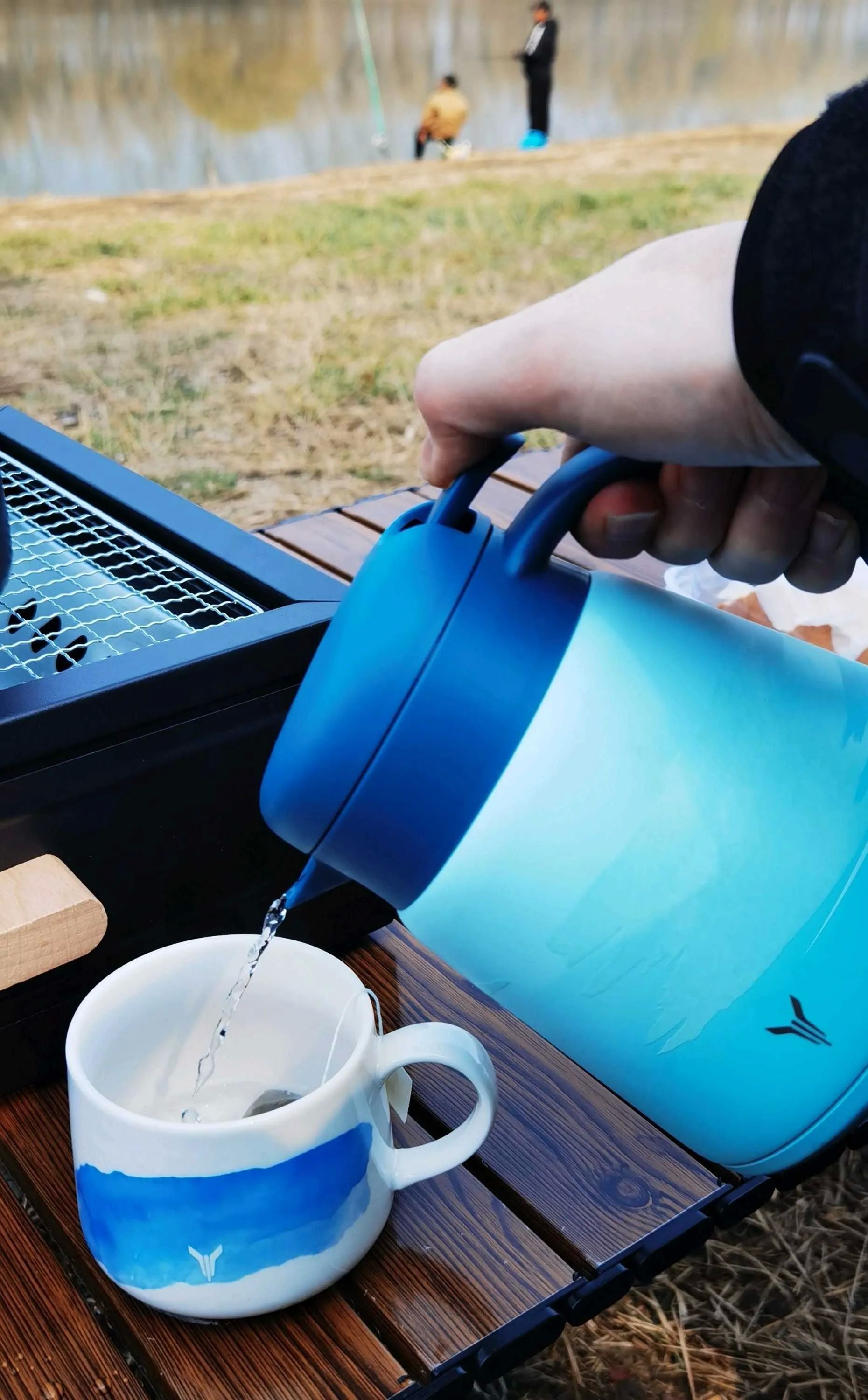 搭配上蛋卷桌和月亮椅,片片壶500ml容量刚好够一家三口,316不锈钢内胆保温6小时,早上煮的茉莉花茶,下午在帐篷里倒出来还是热的。搭配同系列陶瓷杯(杯底防滑设计,放折叠桌不晃),倒茶时壶嘴不滴漏,连隔壁帐篷的大爷都过来问链接。