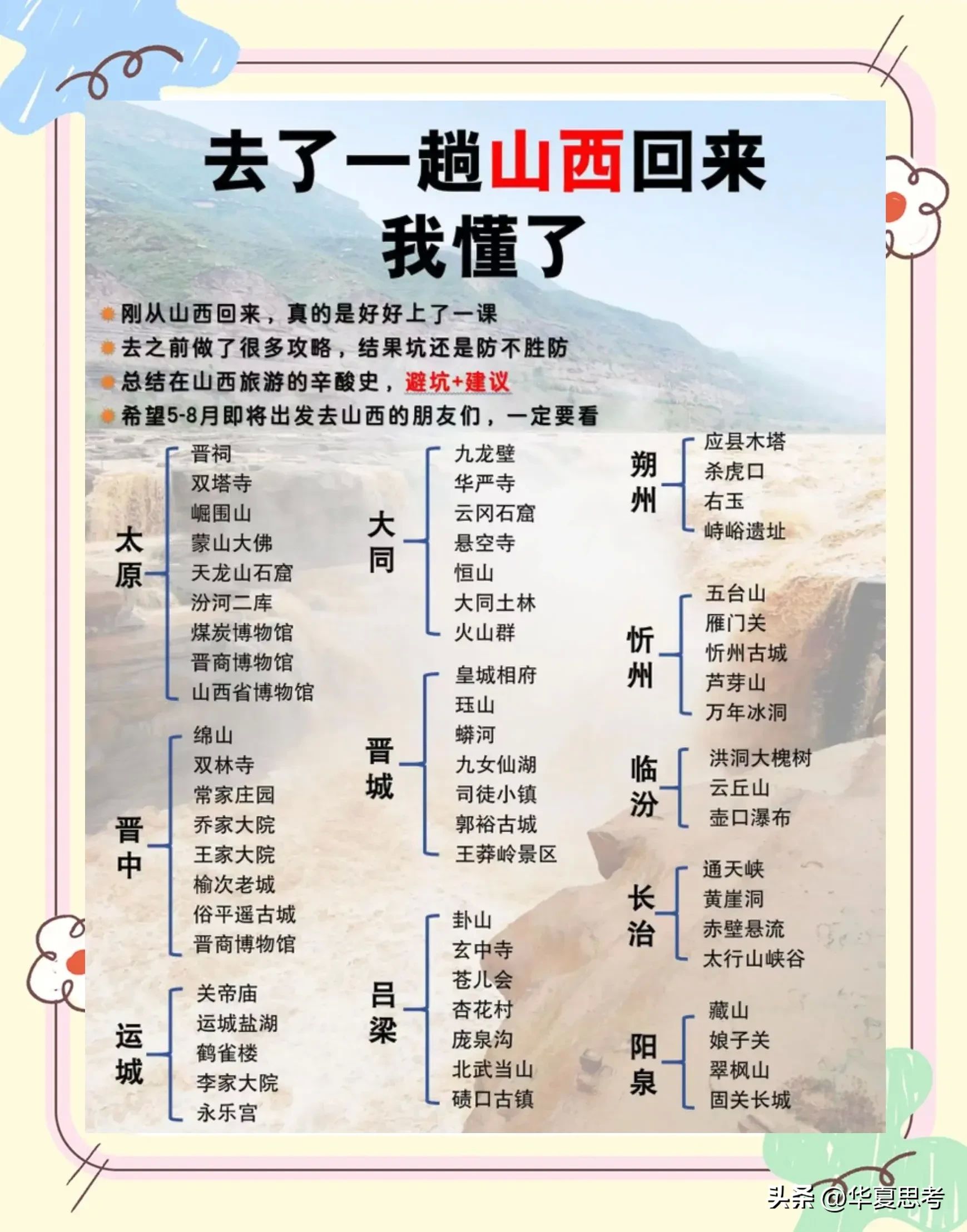 - 旅行建议:建议携带防晒用品和雨具,尤其是在夏季游览时。部分景区如壶口瀑布和云丘山需要步行较长距离,建议穿着舒适的运动鞋。