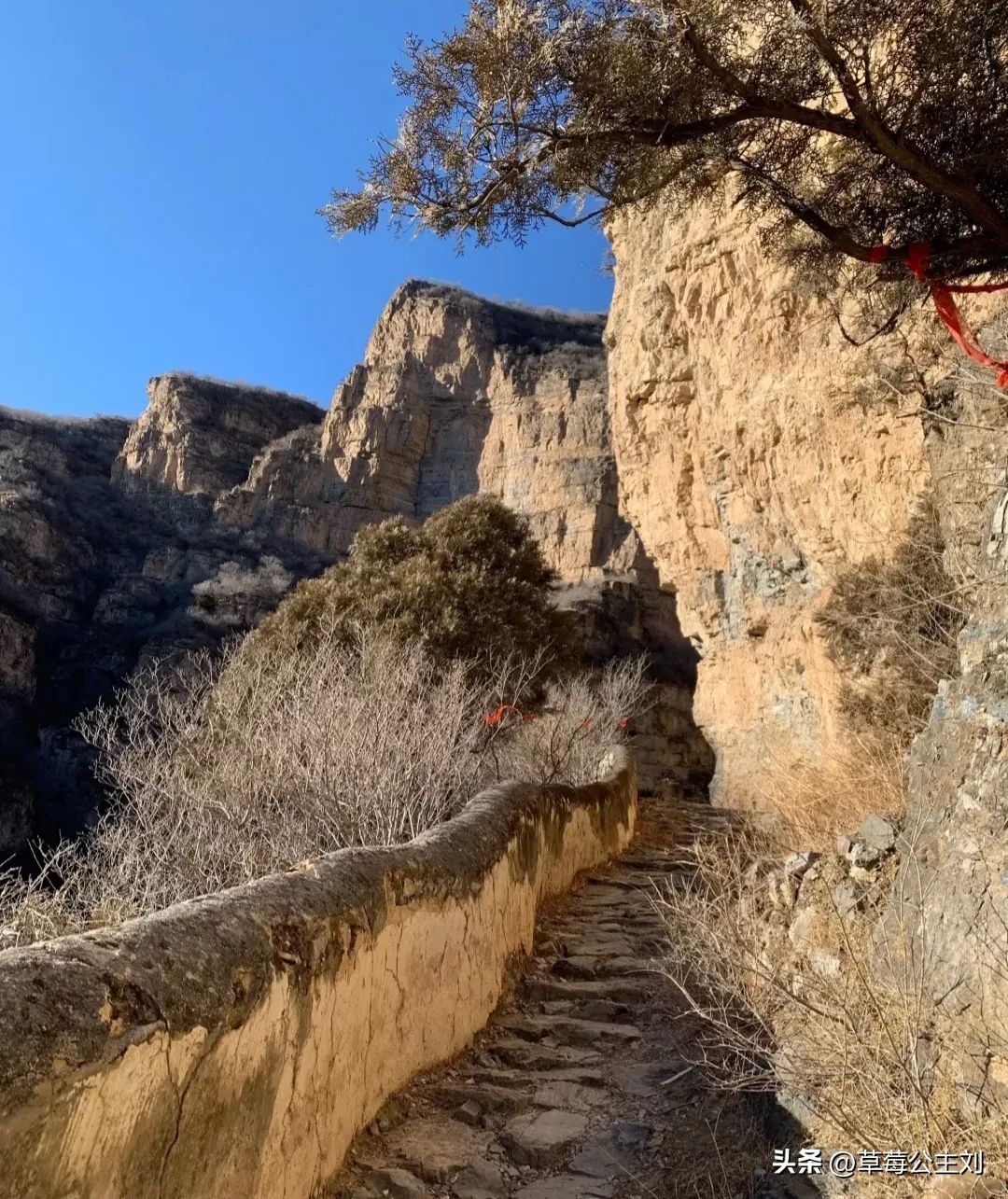 导航鱼塘这个地方就到了,把车停在路边的临时停车场就行。停车后看到对面路边立着“珍爱生命、禁止攀爬野山”的牌子,旁边露出几节石阶,就算您找对悬空寺上山路线的入口喽,真是非常的隐蔽。不过听说现在有大爷在把手,可以从旁边的小路穿行而过。