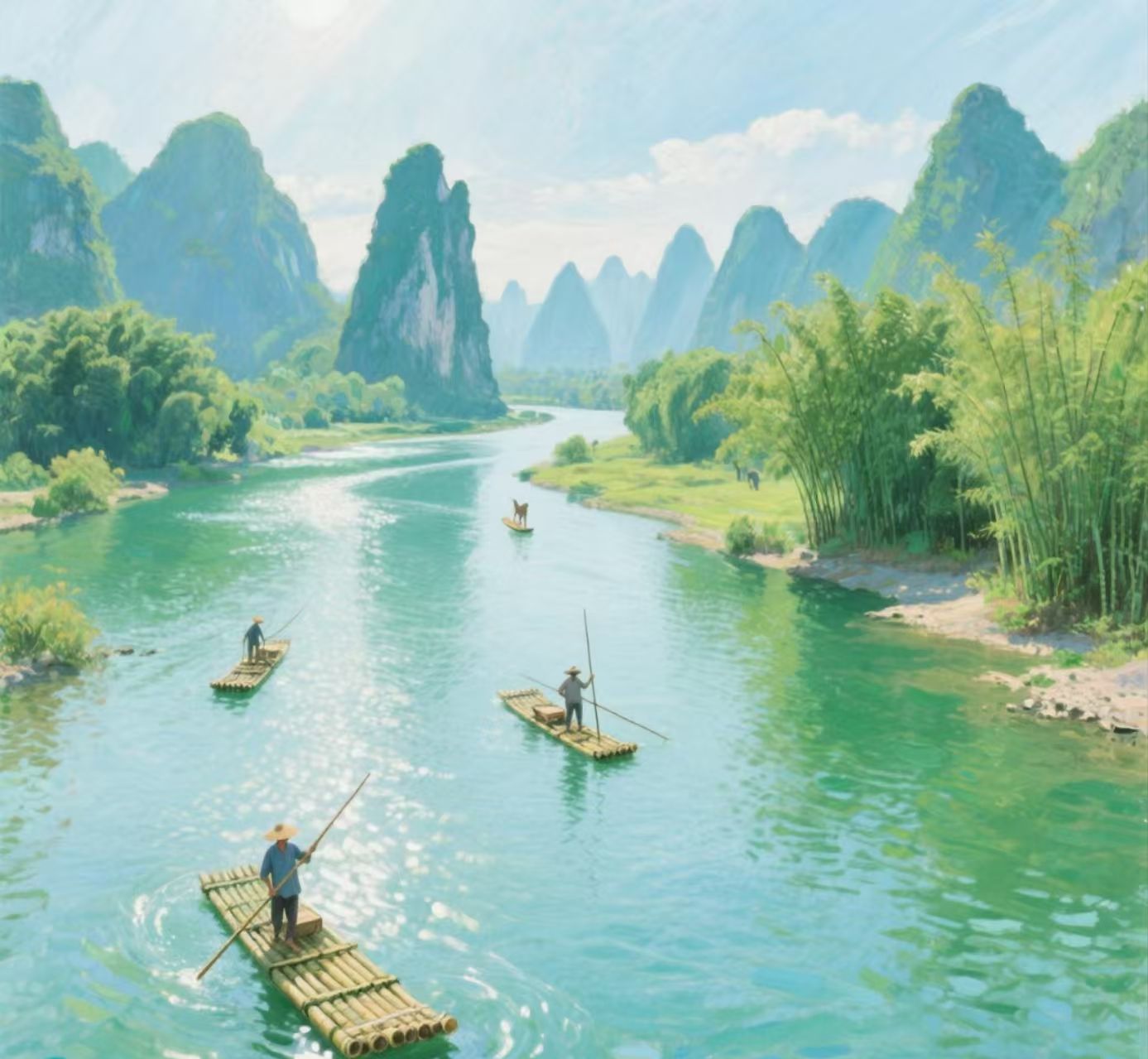 - 特色:喀斯特峰林与碧水竹筏构成“山水甲天下”的意境