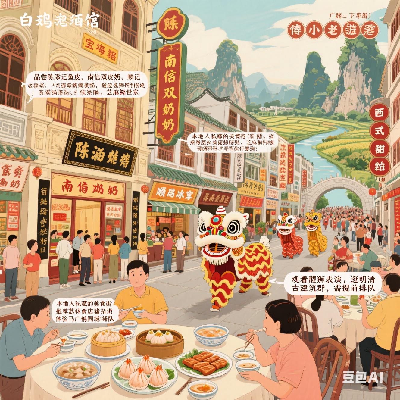 荔枝湾涌:乘船游览荔枝湾,听粤剧私伙局表演,品尝泮塘马蹄糕等传统小吃。