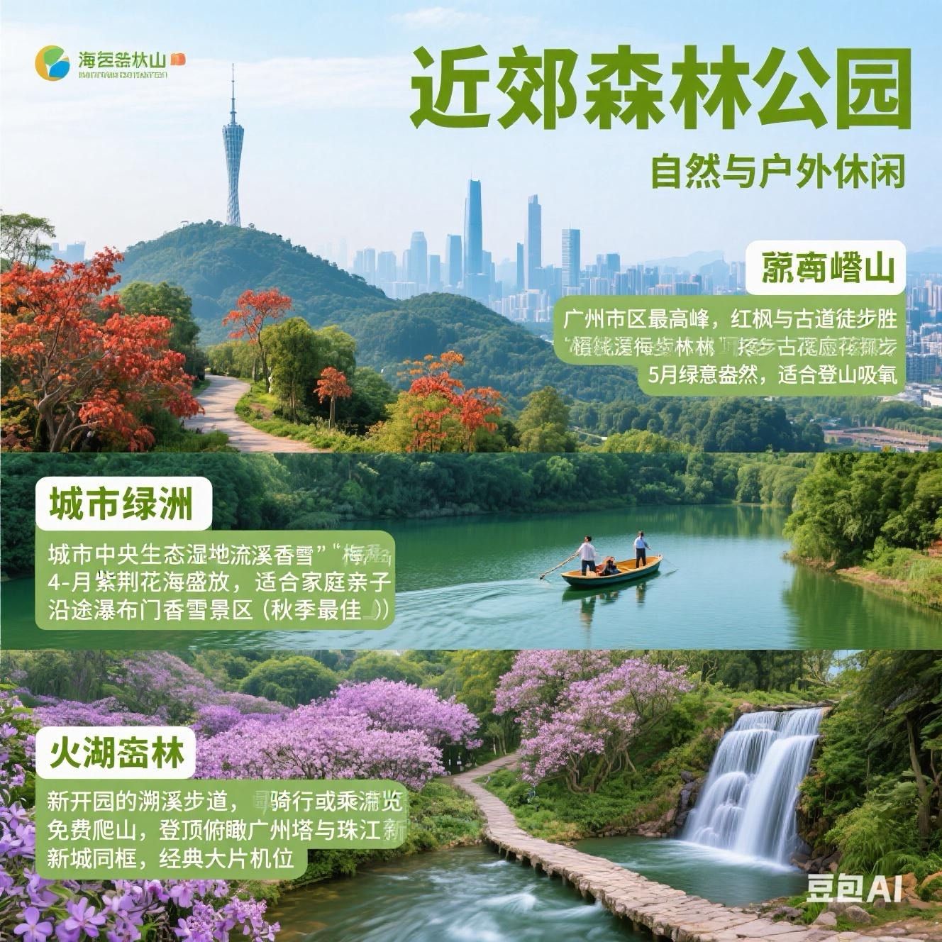 海珠湿地:城市中央的生态湿地,4-5月紫荆花海盛放,可骑行或乘船游览。