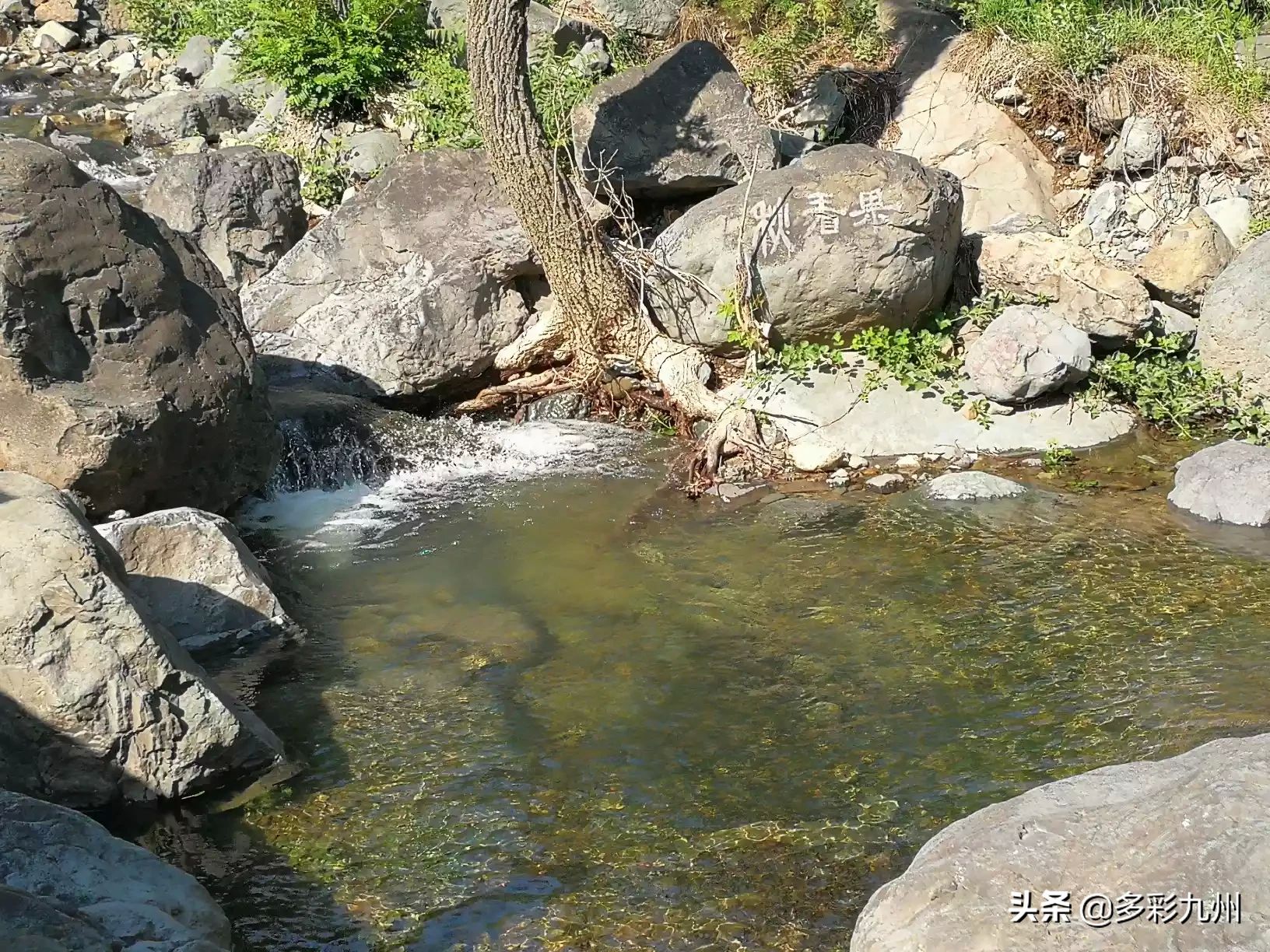 雨后的摩诃峰更加苍翠欲滴,周边的山谷里到处是溪流,一股山泉从东北方的半山腰倾泻而下,极速地奔向山间的河里。据说,山谷中的两股小溪是黛溪河的两条主要源流。几位女士禁不住这大山的诱惑,纷纷蹲到河边的岩石上戏水去了。