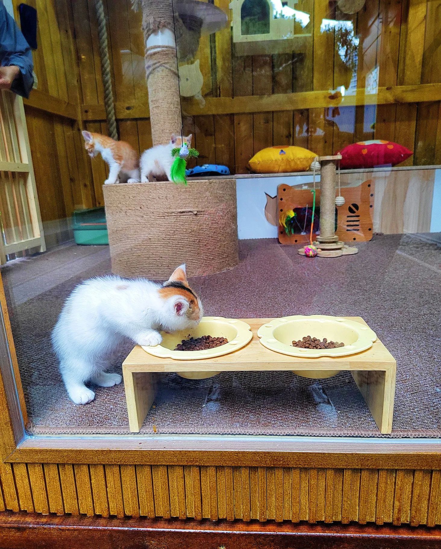 这是一家可以带宠物踏入的寺院,里面有一间猫舍,取名叫大橘禅院。好几只小猫在里面或吃或喝或玩耍。恰好有位僧人进去给小猫咪点眼药水,借此机会,我也有幸撸了撸猫。