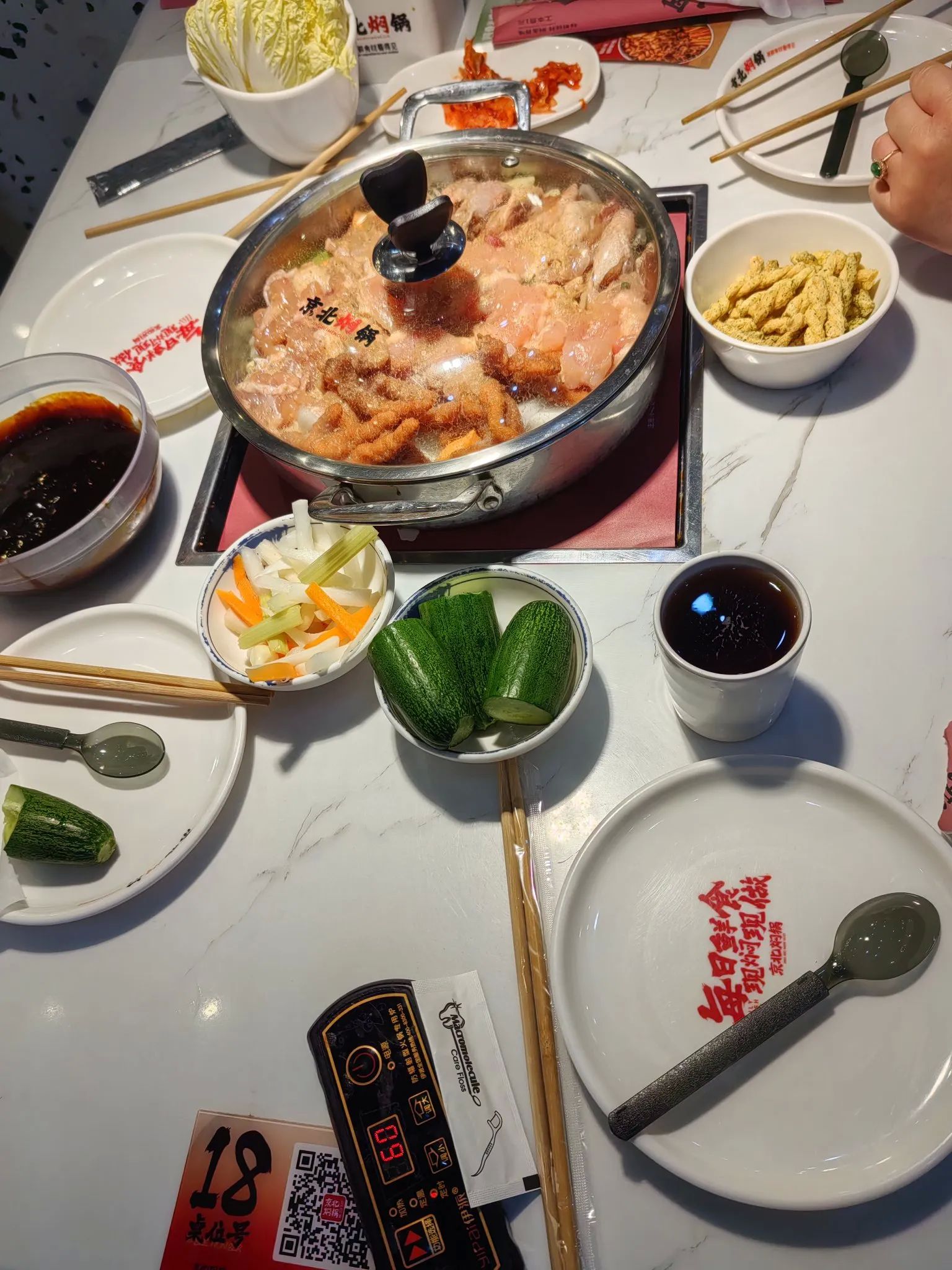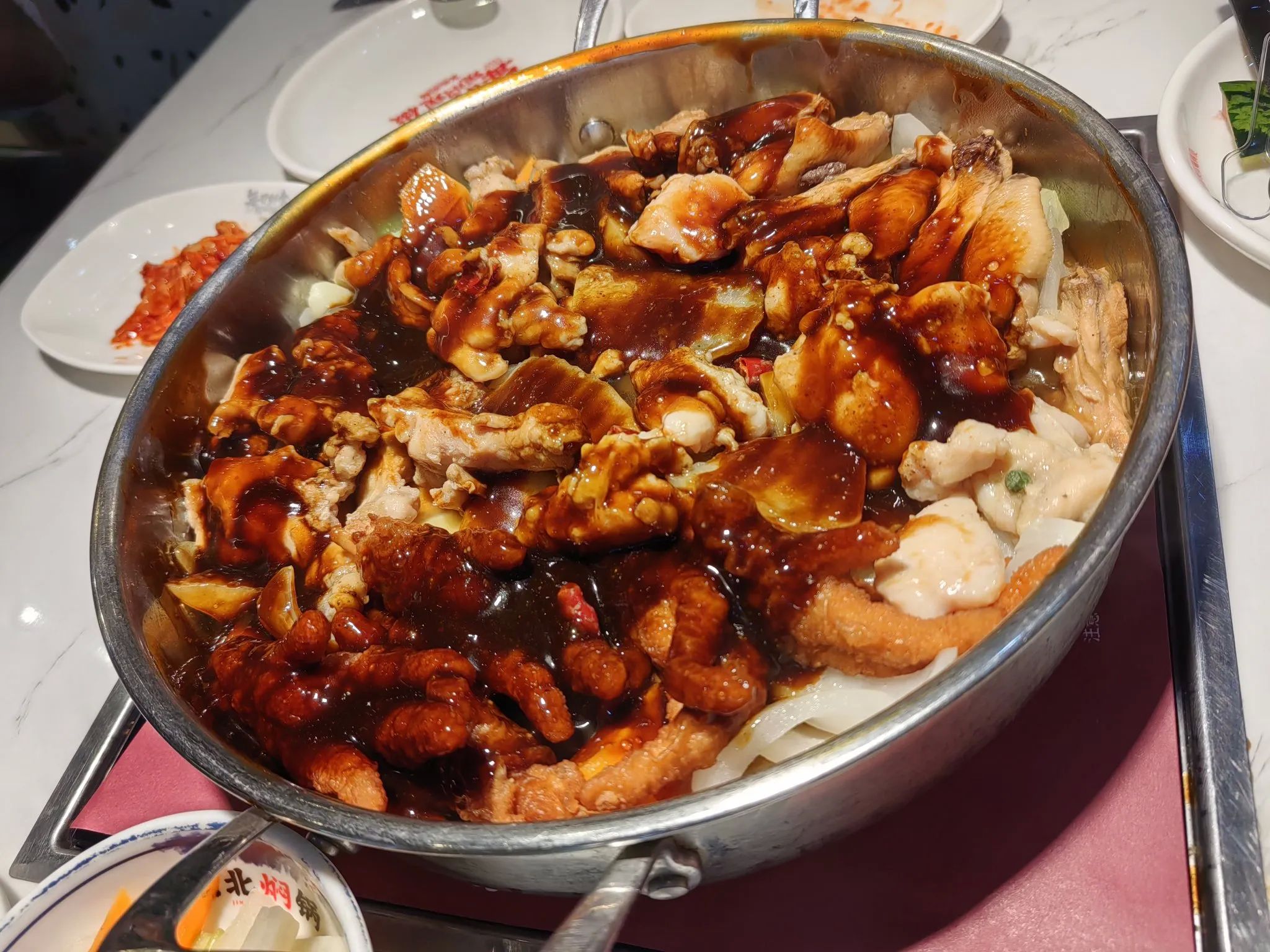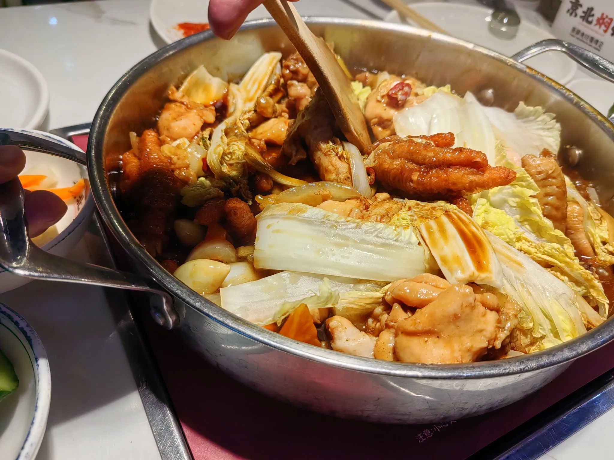 我们来到一家叫京北焖锅的餐厅,服务员很热情地接待了我们,因为我先生不吃海鲜,所以我们四个人点了一锅酱香口味的焖鸡。