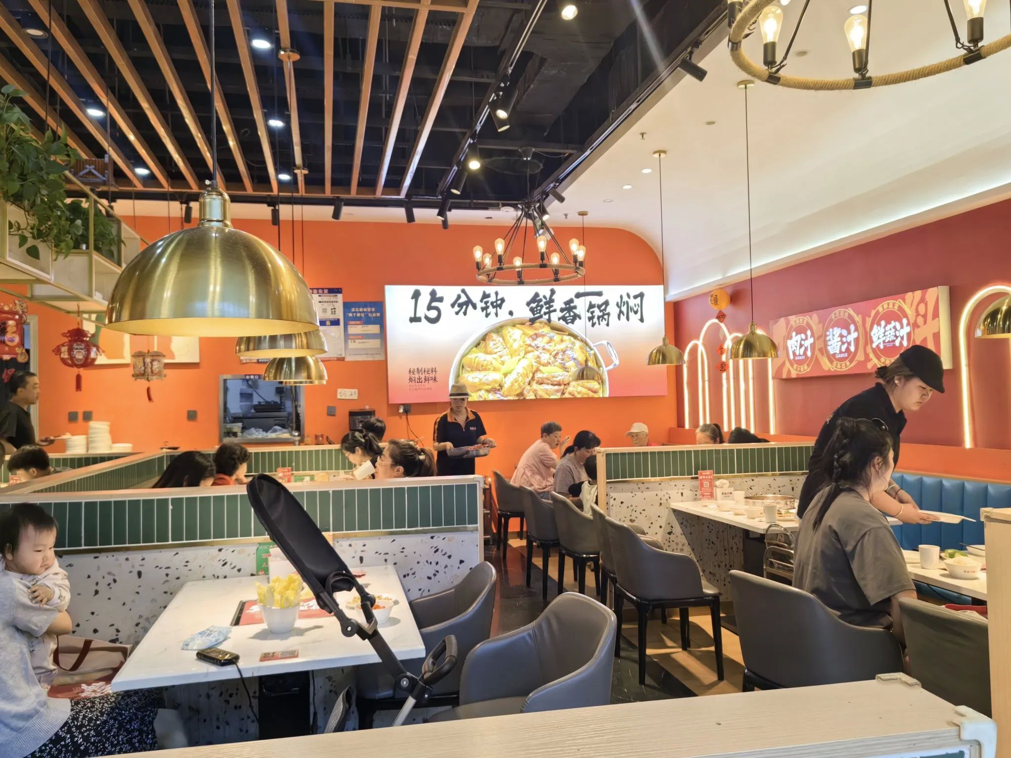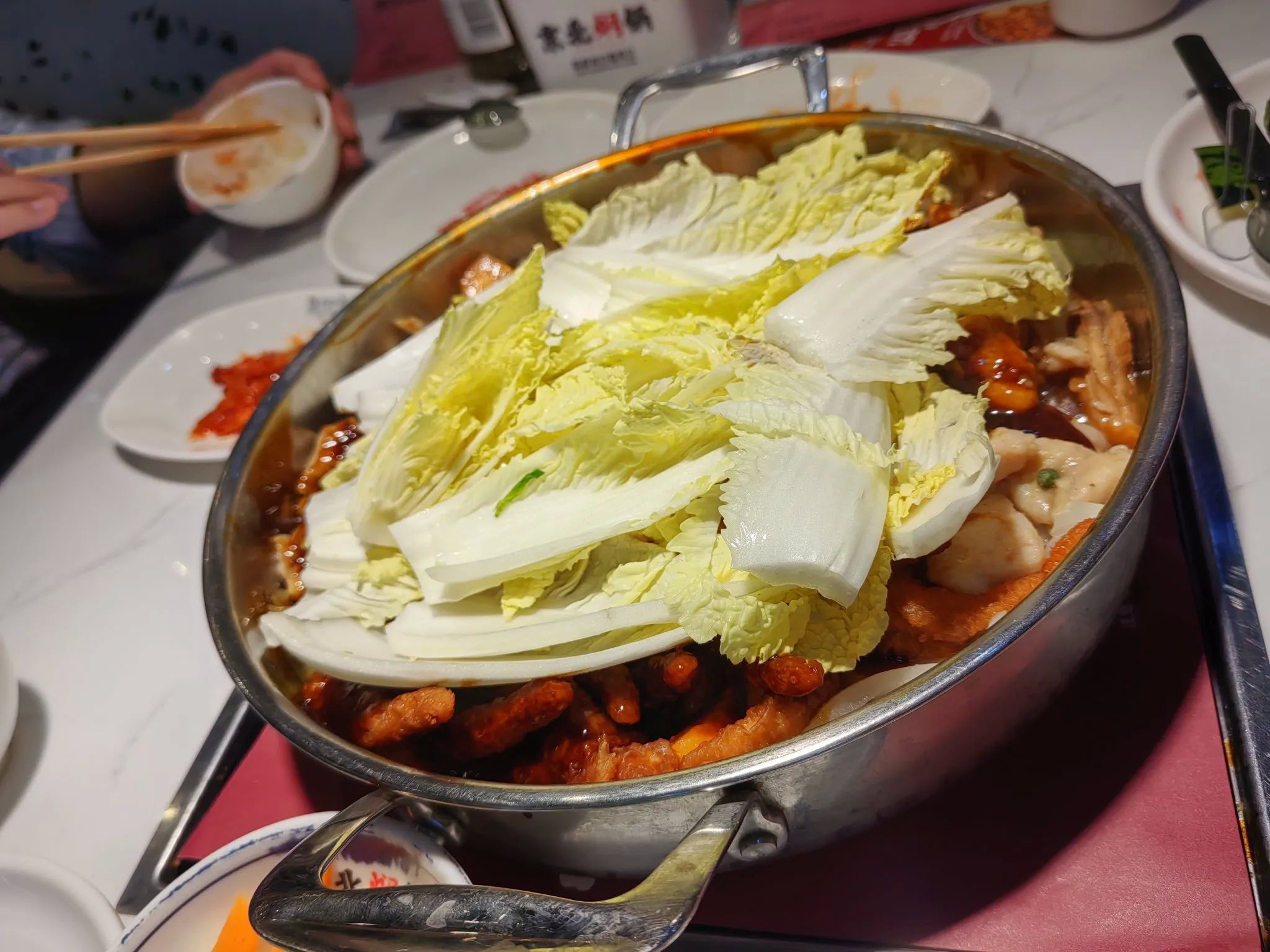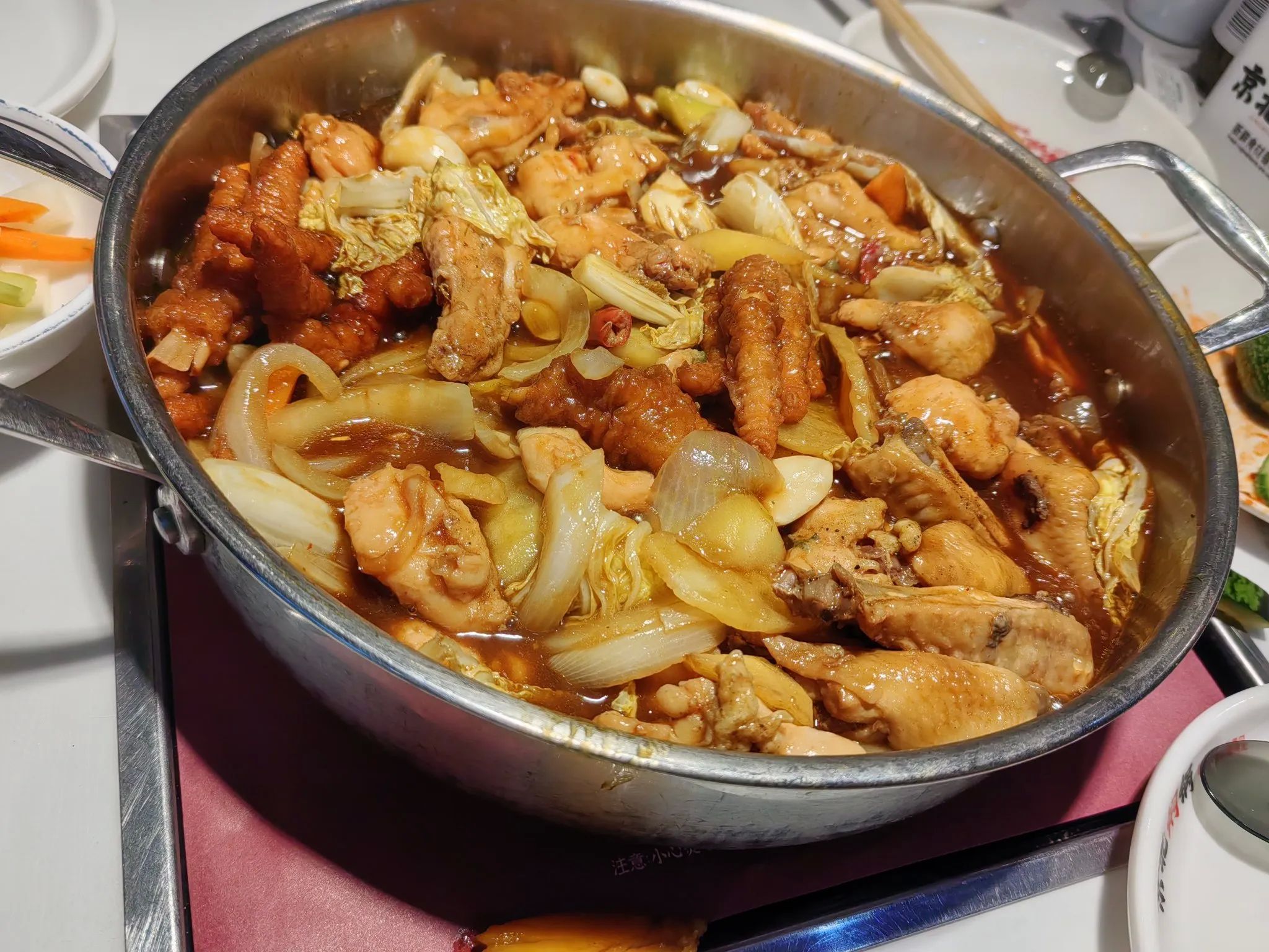 我们来到一家叫京北焖锅的餐厅,服务员很热情地接待了我们,因为我先生不吃海鲜,所以我们四个人点了一锅酱香口味的焖鸡。