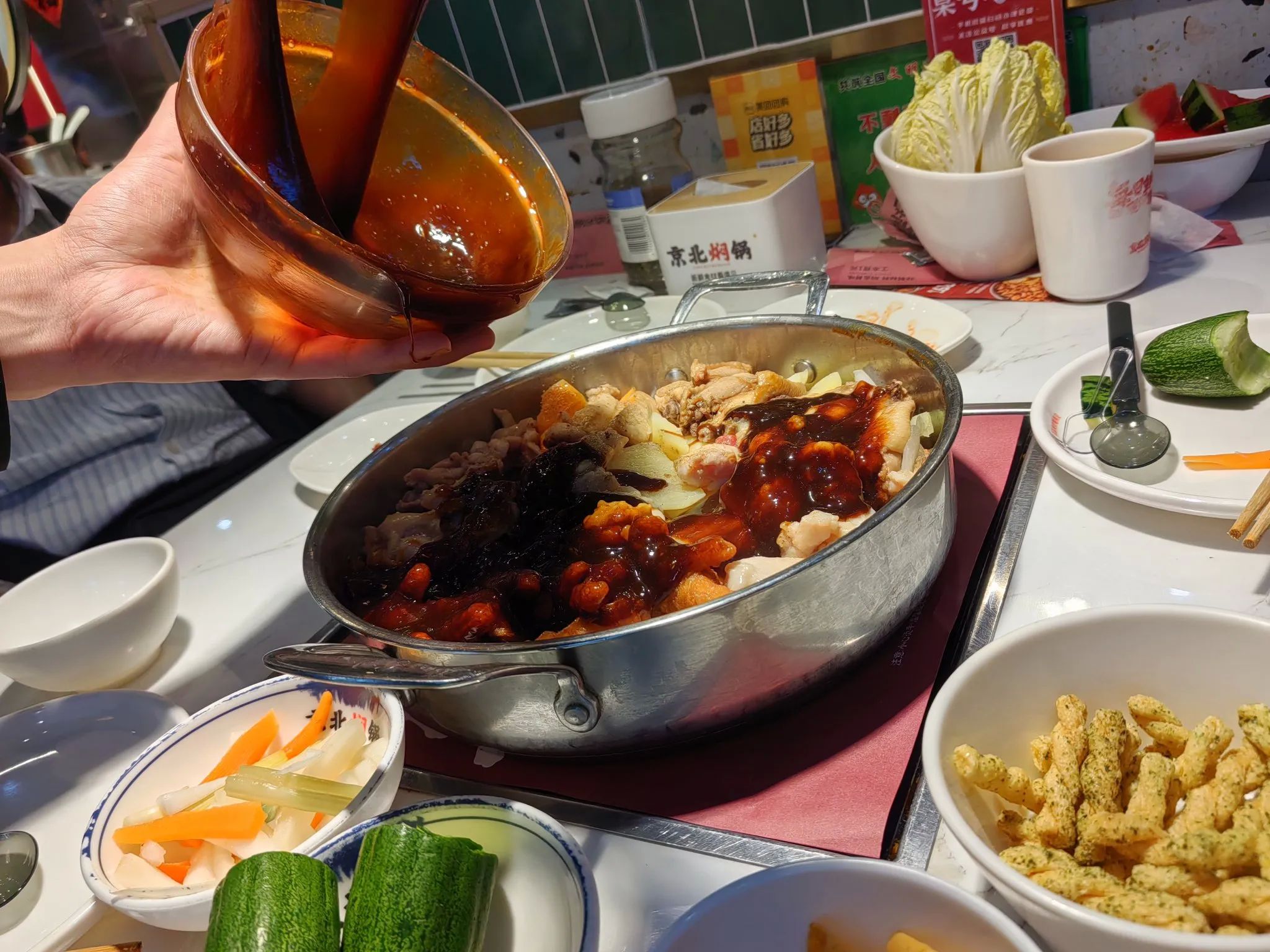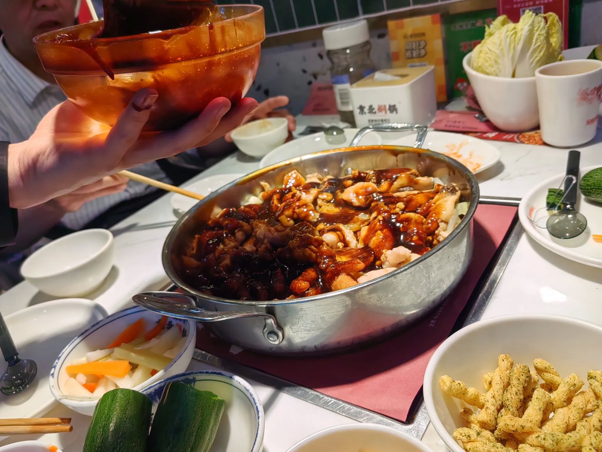 当装鸡肉的锅子开锅后,服务员便把一大碗的酱料边搅和边往锅里倒,问他能不能买一碗他家的调料?答复是不可以的,说是他们家自己秘制的酱料。