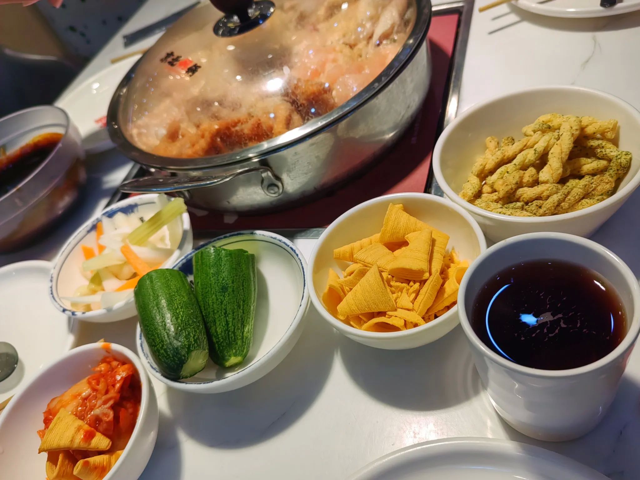 当装有鸡肉的锅具端上来时,一大碗这家餐厅自己调制的酱料也一同端了上来,先放一边,等鸡肉锅开锅后,再将调料放进去。