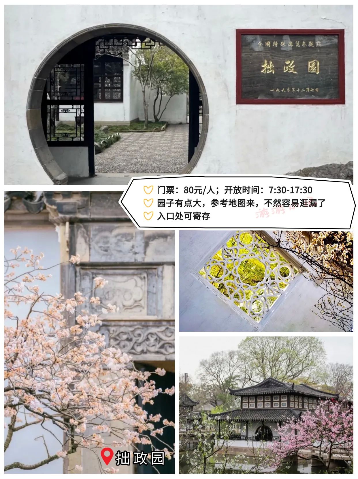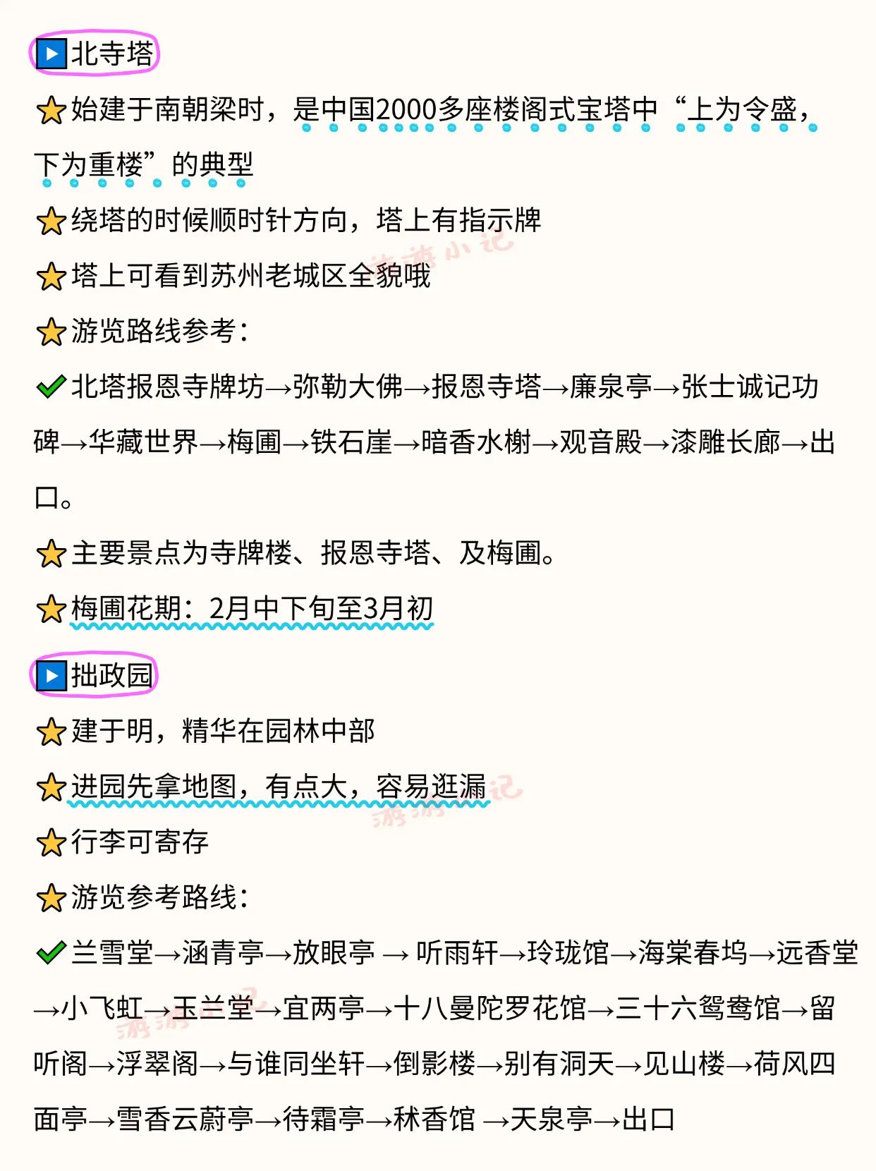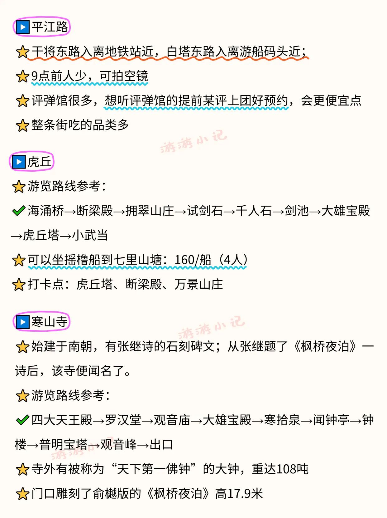 游客在游玩出行时可以优先选择地铁,苏州主城区高峰时间段会堵车。苏州博物馆本馆需要提前一周预约,周末属于秒空状态,手速要快。拙政园进园先拿地图,有点大,容易逛漏。平江路9点前人少,可拍空镜。虎丘游览路线参考:海涌桥断梁殿拥翠山庄试剑石千人石剑池大雄宝殿虎丘塔小武当。留园游览路线参考:明瑟楼—曲溪楼—五峰仙馆—林泉奇硕之馆—冠云峰—盆景园—至乐亭—舒啸亭—出口 。可寄存行李。