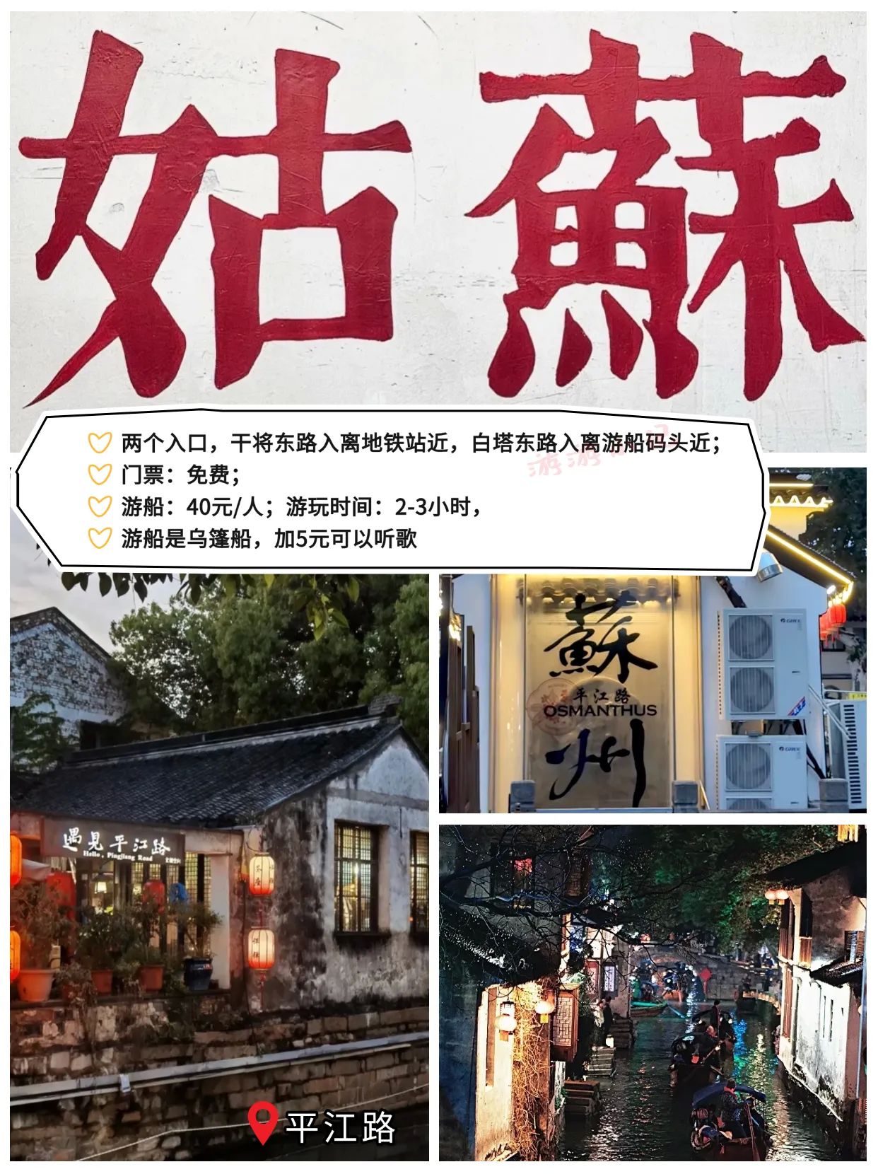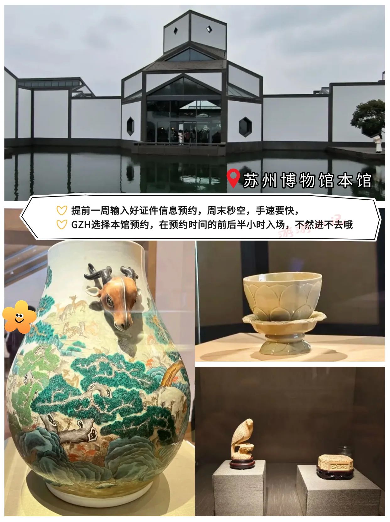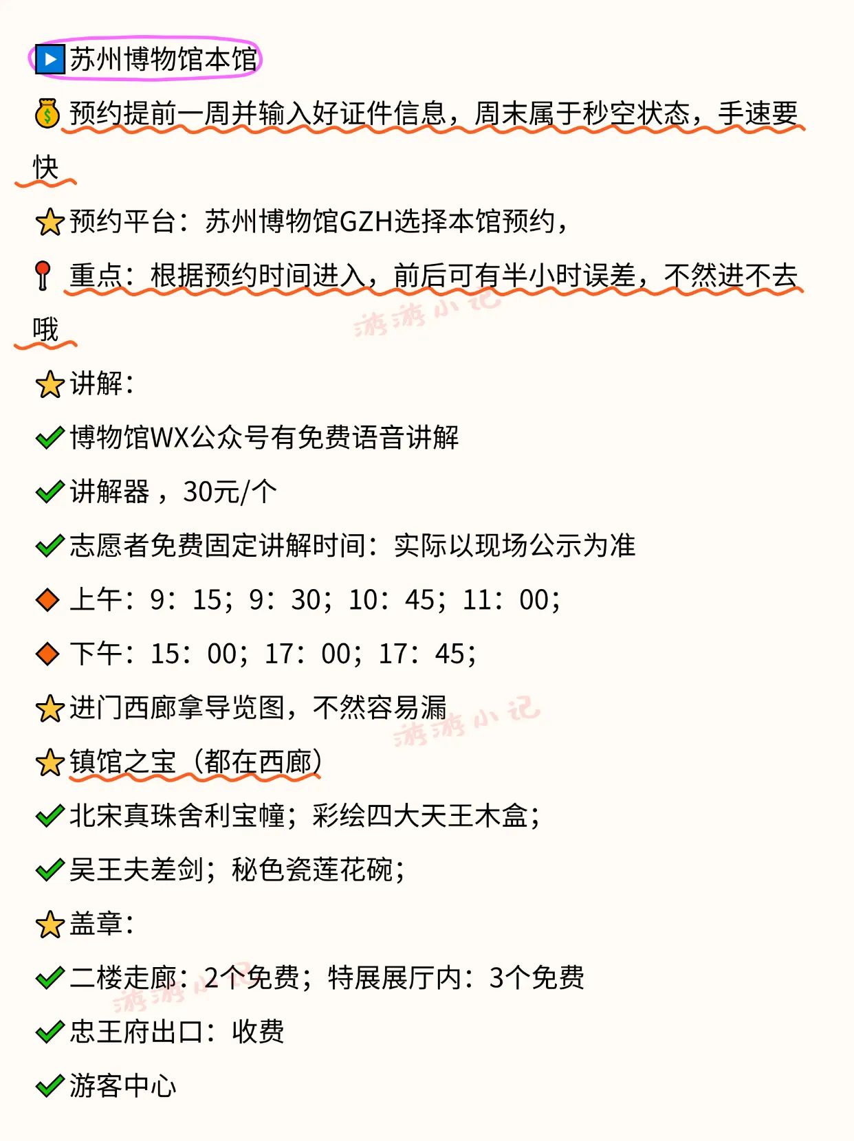 游客在游玩出行时可以优先选择地铁,苏州主城区高峰时间段会堵车。苏州博物馆本馆需要提前一周预约,周末属于秒空状态,手速要快。拙政园进园先拿地图,有点大,容易逛漏。平江路9点前人少,可拍空镜。虎丘游览路线参考:海涌桥断梁殿拥翠山庄试剑石千人石剑池大雄宝殿虎丘塔小武当。留园游览路线参考:明瑟楼—曲溪楼—五峰仙馆—林泉奇硕之馆—冠云峰—盆景园—至乐亭—舒啸亭—出口 。可寄存行李。