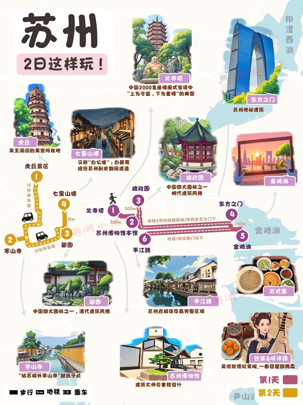 苏州是一个美丽的城市,有着丰富的文化和自然景观。以下是一个两天一夜的苏州旅行攻略,涵盖了交通、住宿、景点和美食等方面。