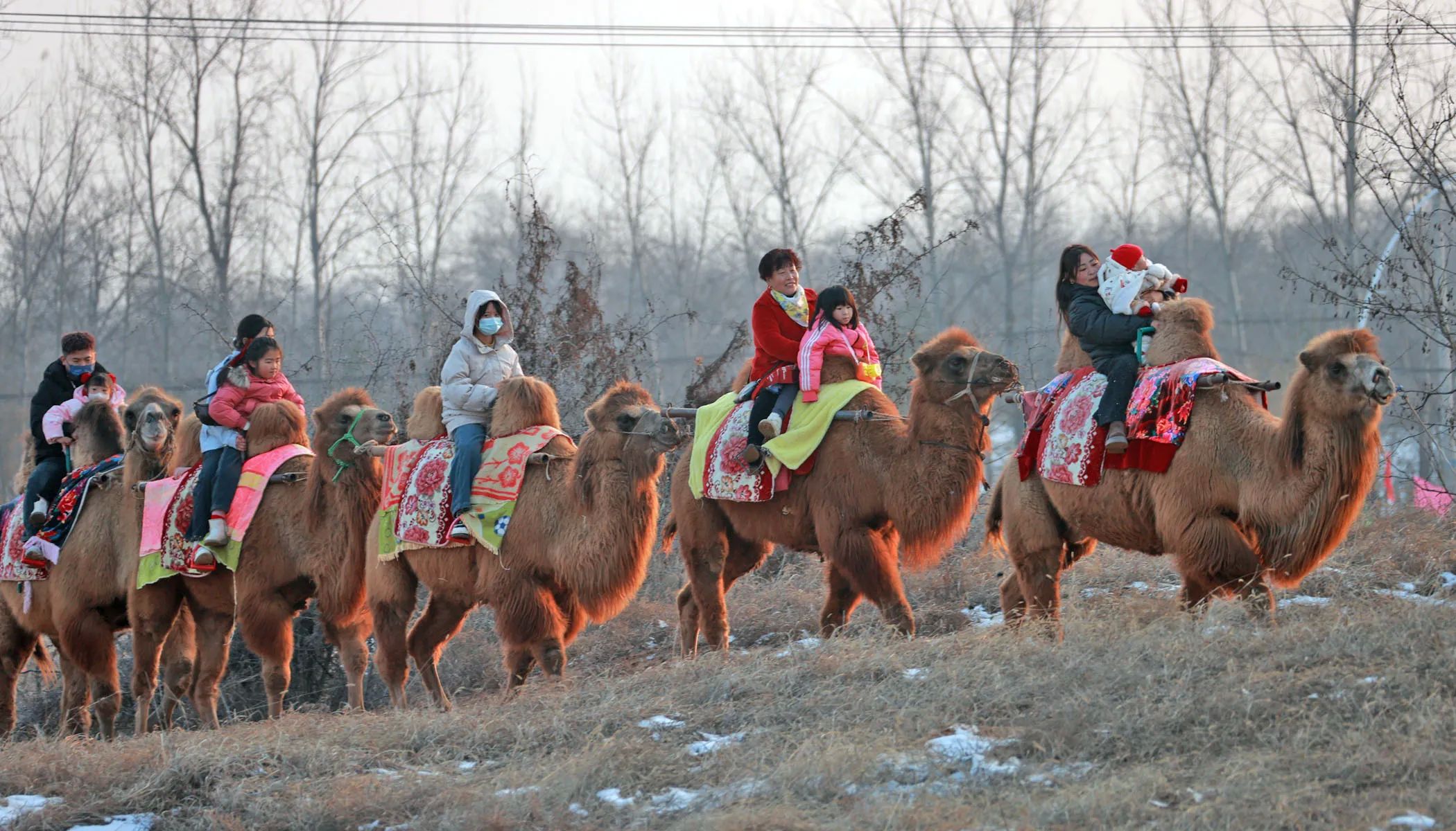 (李世居、王建)1月29日,伴随驼铃叮叮当当的响声,游客荡悠悠地骑着骆驼在大荔沙苑景区“踏春”玩沙欢庆“春节”,玩得不亦乐乎。