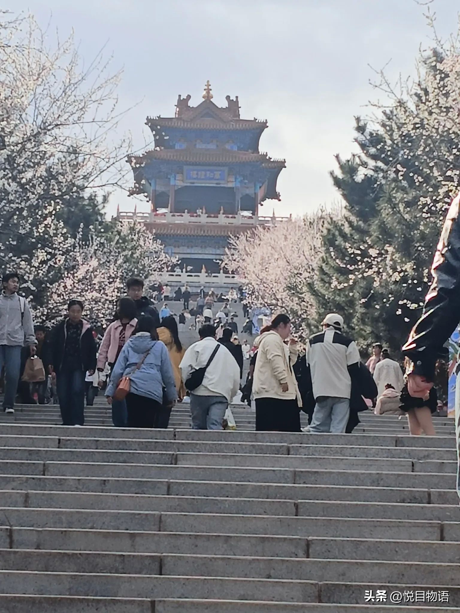 一路缓坡行进,不太长时间便能看到山顶的观景台。从山下到观景台上要走365级台阶,这365级台阶分12个缓步台,每一段距离的台阶数正好和1~12月的天数相同。365级台阶与刚刚绽放的桃花相映成趣,一步一景,我们很轻松的就爬了上去。