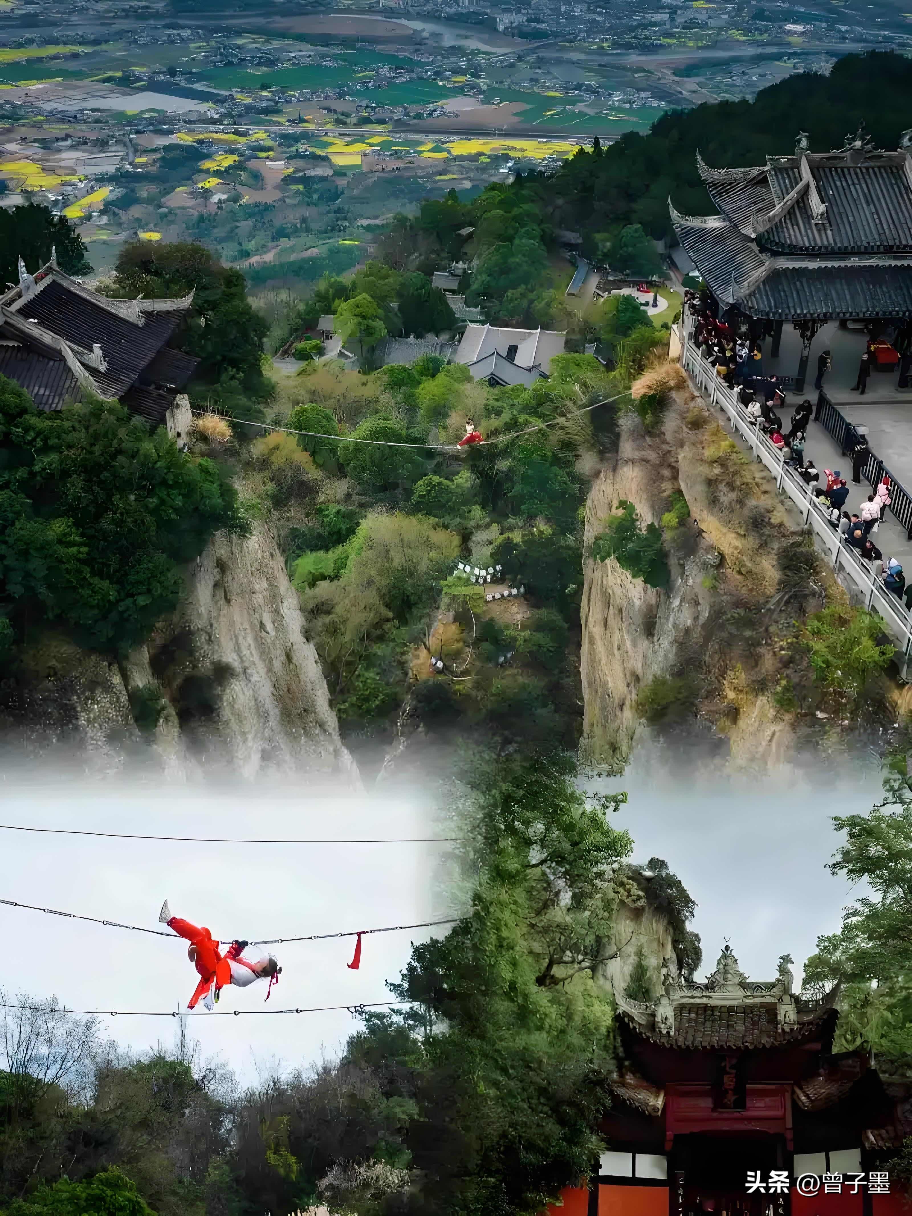 窦圌山的绝技表演——铁索飞渡已有数百年历史。表演者在连接三峰的铁索上行走、翻滚,惊险刺激,展现了当地民俗文化的独特魅力。