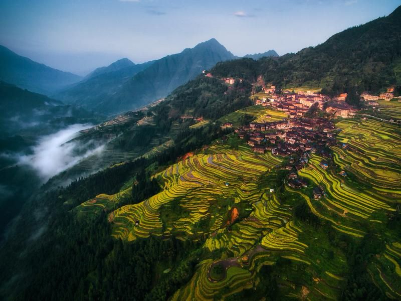 农耕文明史诗:苗族人依山开垦的梯田绵延数公里,春季灌水如镜,秋季稻浪翻滚。