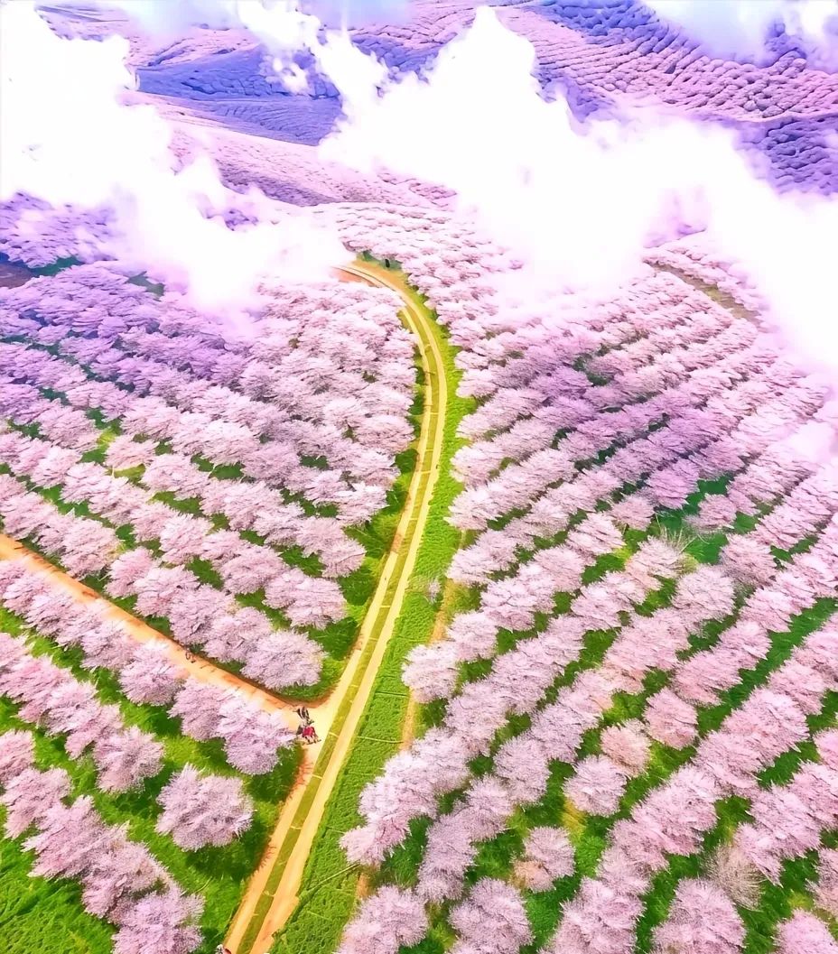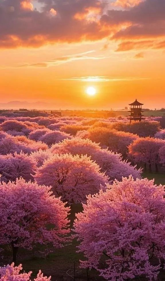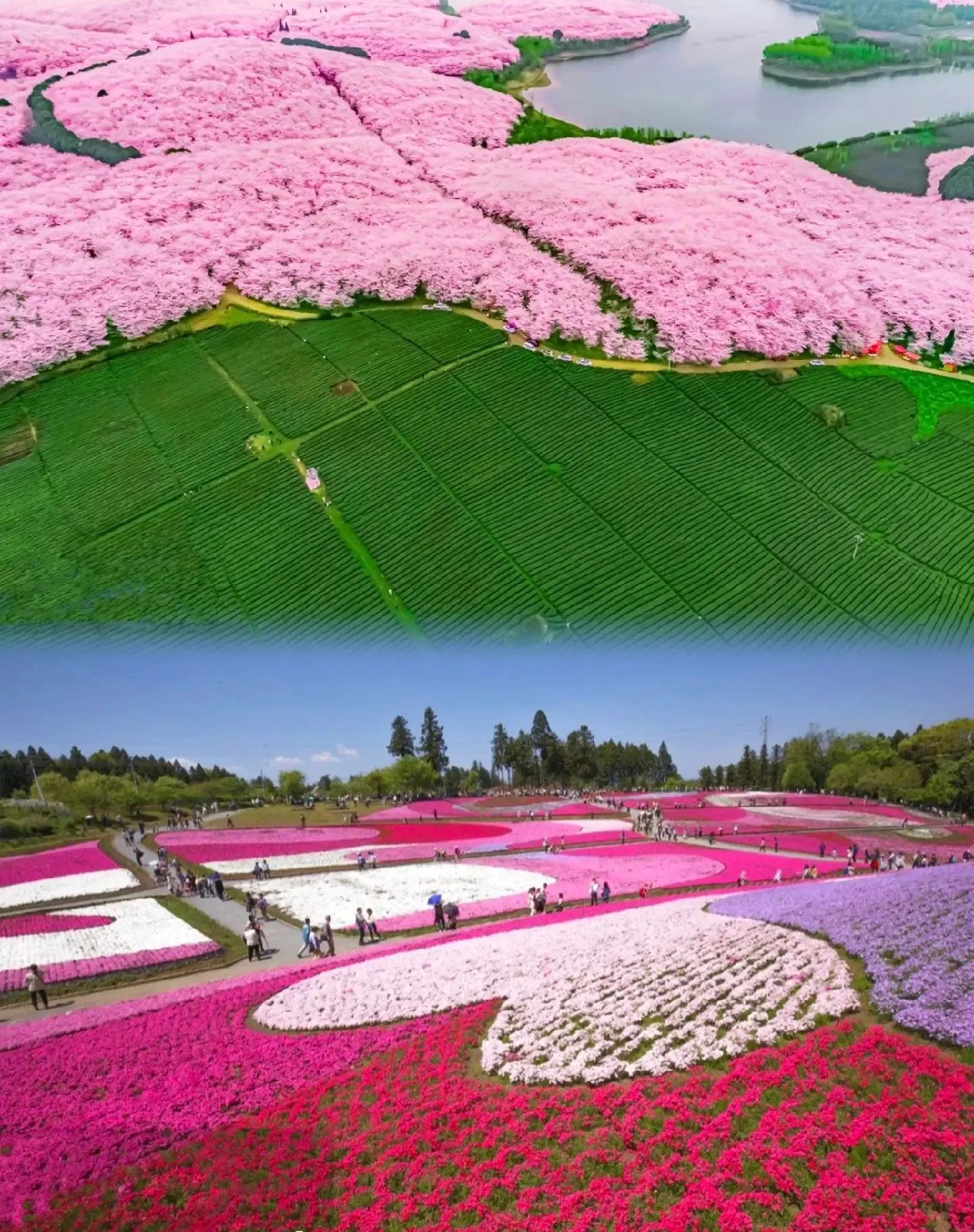 3. 神仙场景:樱花与茶园、湖泊交叠,航拍如“粉色地毯”,日系电影感拉满!