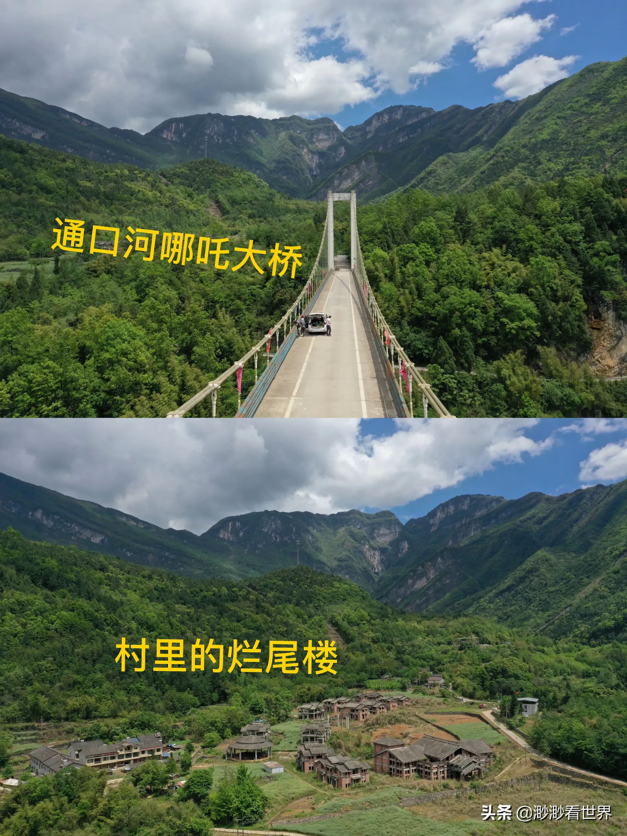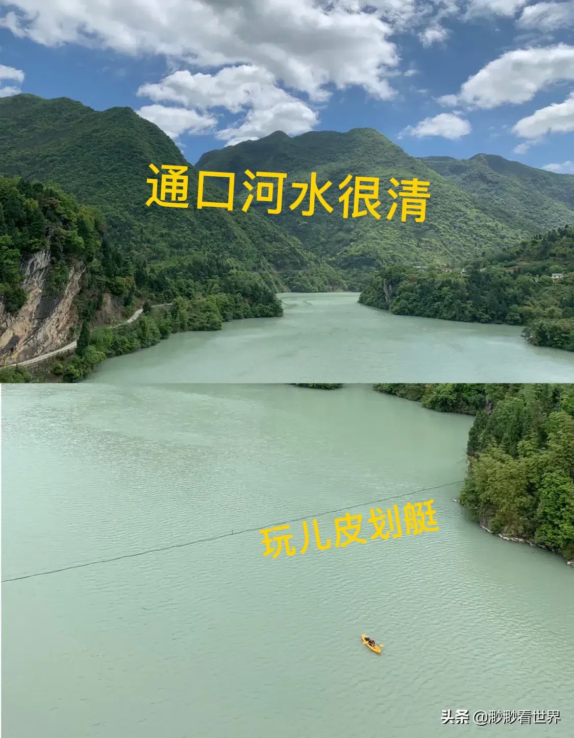 天气好的时候,在通口河哪吒大桥就能看到山上的金光洞,非常雄伟壮观。通口河水很清,还遇到几个德阳的游客在河里玩儿皮划艇。真的羡慕了,太爽了!