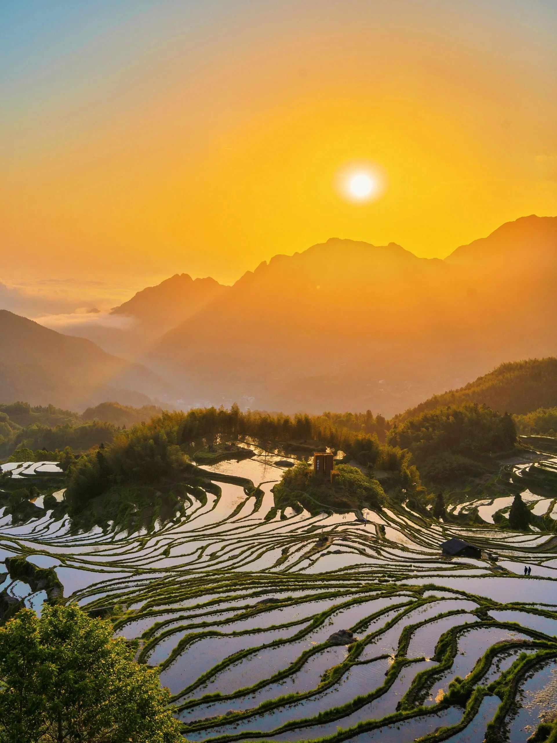 - 日出绝景:5:30蹲守观景台,云海漫过梯田时,水面倒影把天空染成橘子汽水色