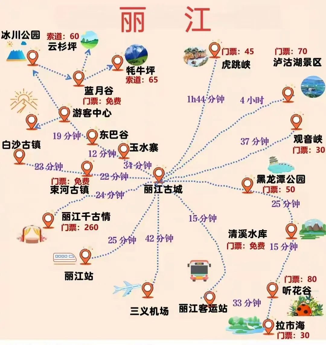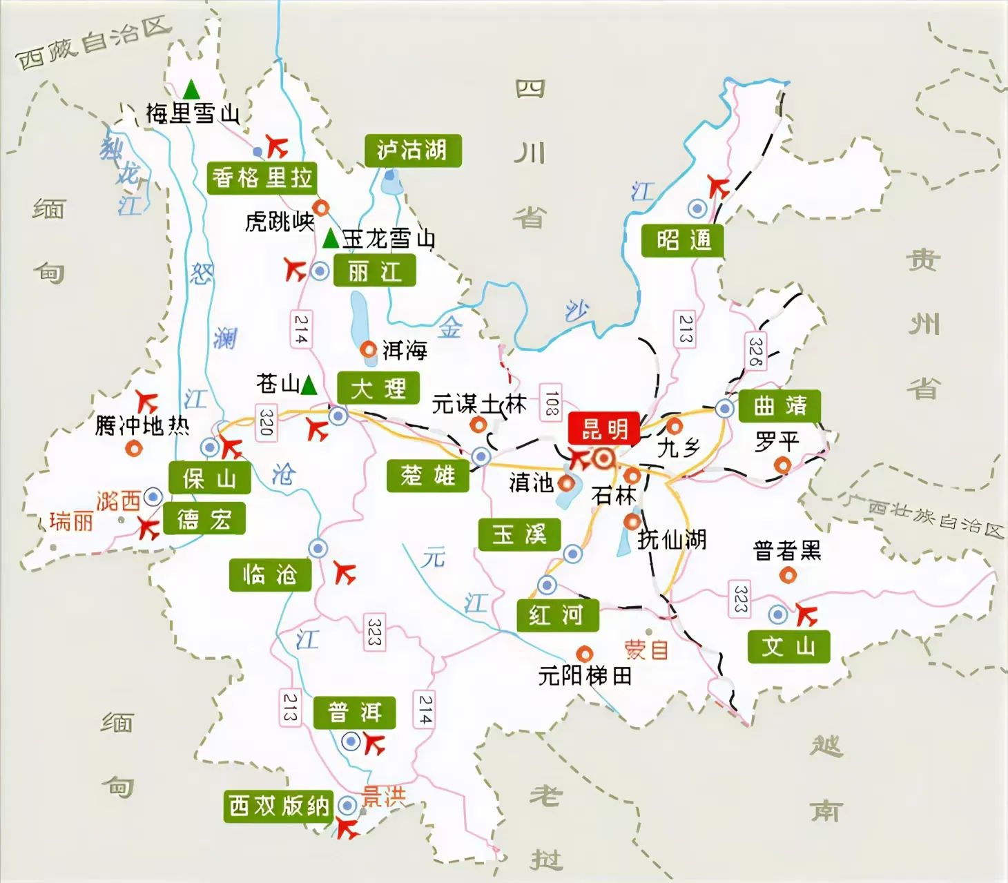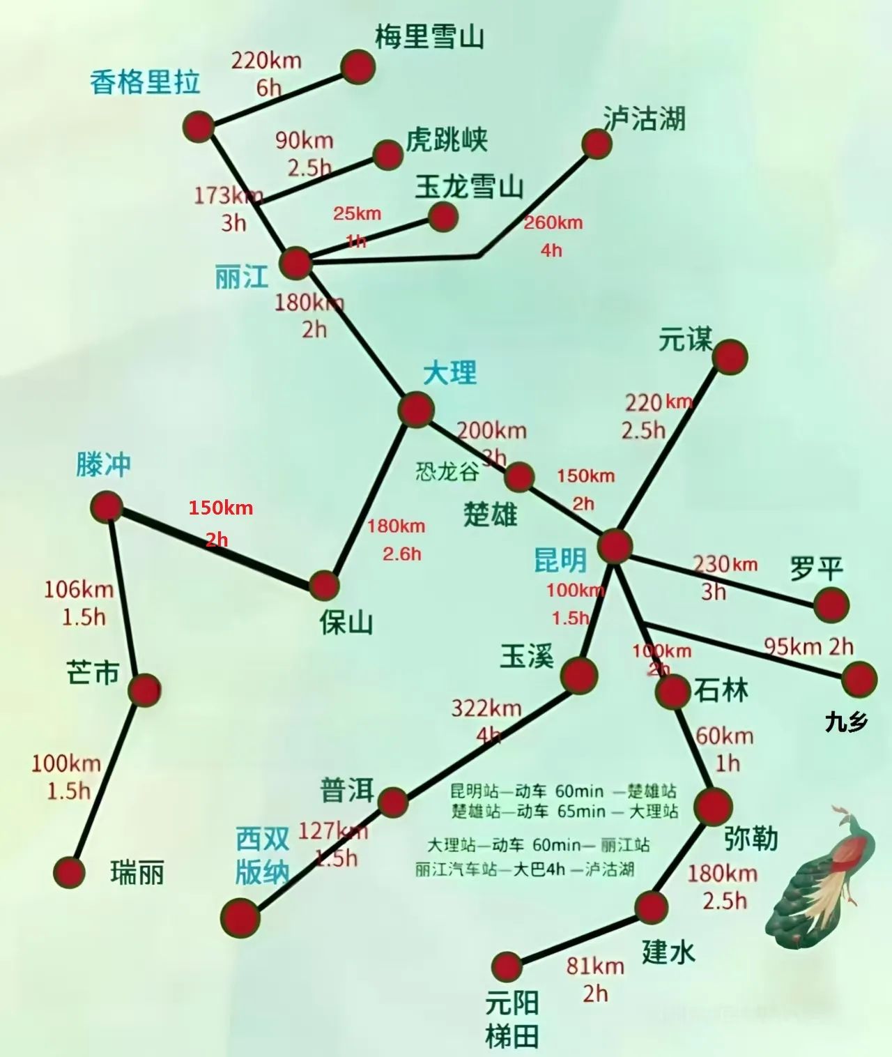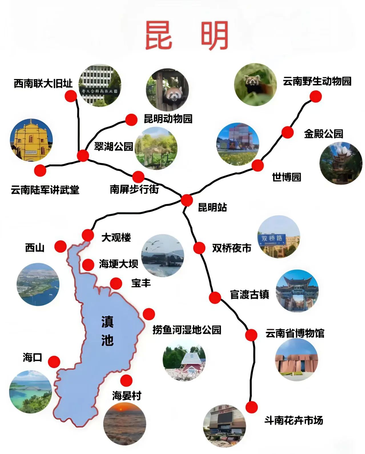[比心]云南主要旅游路线及景点攻略[比心] 本人有幸走遍云南16个州市、129个县区及其主要旅游景点,现整理分享云南主要旅游路线及景点攻略,个人观点,难免错漏,仅供参考。另,云南面积是人口大省河南的2.4倍,且92%是高原山区,通常各地之间路程较远且交通相对受限,须提前合理计划;此日程安排较为紧凑,根据体力视情延长调整。 [心]一、昆 明(住主城北京路中南段或人民中路临近南屏街的地铁沿线周边)第1天:上午:九乡风景区(需早起7点前出发);下午:石林风景区及景区大门附近的石得利地质博物馆。第2天:上午:西山风景区(含聂耳墓园、华亭寺)或滇池海埂大坝(冬季看红嘴鸥);下午:云南陆军讲武堂及翠湖;晚上:昆明老城及南屏步行街。第3天:上午:昆明圆通动物园或昆明动物博物馆;下午:省博物馆或斗南花市;晚上:观看《云南印象》。备选景点:圆通寺、金殿,黑龙潭、大观、海埂公园,西南联大旧址,官渡古镇,野生动物园。[心]二、大 理(住古城南门周边)第1天:上午:昆明至大理(自驾或动车);下午:大理古城及云南提督府暨杜文秀帅府;晚上:大理古城。第2天:早上:洱海龙龛古码头;上午:崇圣寺三塔:下午:大理至丽江(自驾或动车);晚上:丽江古城。备选景点:苍山景区(含索道)、双廊古镇、蝴蝶泉。[心]三、丽 江(住古城南门或七星街周边)第1天:上午:丽江古城及木府;下午:丽江博物馆及黑龙潭公园;晚上:观看《丽江千古情》。第2天:白天:玉龙雪山及蓝月谷(雪山大索道票紧俏需提前几天购买);晚上:丽江古城。第3天:上午:白沙古镇或丽江束河古镇;下午或晚上:乘机或火车返回。备选景点:虎跳峡(1天)、泸沽湖落水村(2天),观看《丽水金沙》或《印象丽江》演出。 [心]四、迪 庆(住主城长征、康珠大道周边或独克宗古镇)第1天:上午:松赞林寺;下午及晚上:独克宗古城。第2天:白天:普达措国家森林公园(需早起8点前出发);晚上:乘机或动车返回。备选景点:巴拉格宗景区(1天);梅里雪山雨崩村(2天)。[心]五、腾 冲(住主城天成、翡翠路周边或和顺古镇)第1天:上午:火山热海及大滚锅;下午及晚上:和顺古镇及艾思奇故居。第2天:上午:国殇园及滇西抗战纪念馆;下午:腾越根雕艺术博物馆或杜鹃王古木文化博览园;晚上:观看《梦幻腾冲》演出。备选景点:银杏村(11至12月份)。[心]六、西双版纳(住告庄周边)第1天:白天:中科院植物园;晚上:告庄西双景(星光夜市)。第2天:上午:野象谷;下午:原始森林公园。第3天:上午:曼听公园及总佛寺、大佛寺;下午或晚上:乘机或动车返回。[心]七、其 它(各约1天)(一)红河州建水县古城、河口边境游。(二)大理州巍山县古城,祥云县水目山,宾川县鸡足山,剑川县沙溪古镇。(三)文山州丘北县普者黑(6至8月份)、广南县坝美风景区、麻栗坡县烈士纪念园及老山。(四)红河州泸西县阿庐古洞、元阳县哈尼梯田(11月至次年4月)。(五)德宏州瑞丽市姐告边境口岸及一寨两国,芒市大金塔、勐巴拉西公园。(六)丽江市玉龙县老君山、黎明丹霞地貌。(七)昆明市七彩云南欢乐世界、轿子雪山、筇竹寺,安宁市曹溪寺,晋宁县盘龙寺。(八)玉溪市抚仙湖(阳光海岸、禄充、明星鱼洞等)。(九)楚雄州元谋土林、禄丰县世界恐龙谷。(十)昭通大山包景区、豆沙关古镇。[心]备注:寒暑假及黄金周等旅游高峰期交通尤其住宿费比平时高很多甚至数倍,建议尽量避开。如首次游或短期游,首站昆明,其次大理,从丽江乘机或动车返程、中转,建议:先去州市博物馆参观后再去各景点游玩,不建议去:昆明世博园、民族村、花之城、西游洞,大理天龙八部城、喜洲古镇、蝴蝶泉,丽江玉水寨、东巴谷、牦牛坪、拉市海,楚雄州彝人古镇、恐龙谷。