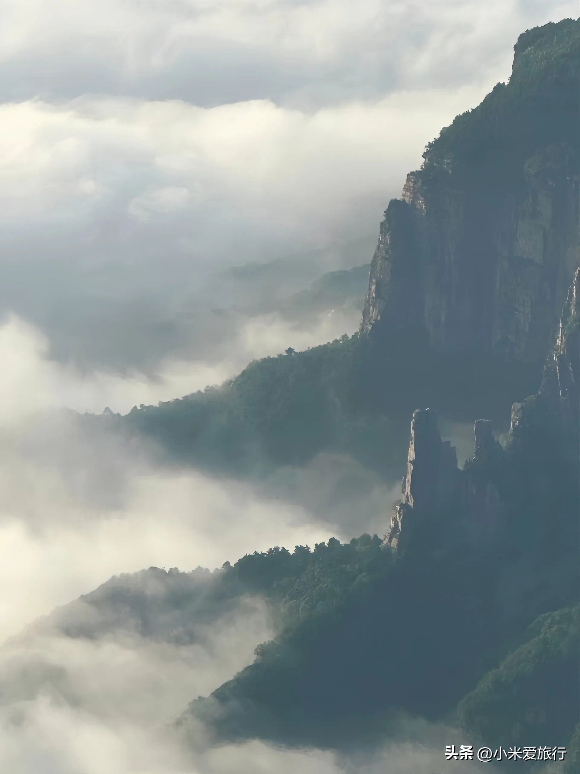 8、王莽岭:南太行的最高峰,汇集了云海、日出、奇峰、峡谷、立体瀑布和挂壁公路等罕见奇观,是八百里太行的精华所在。