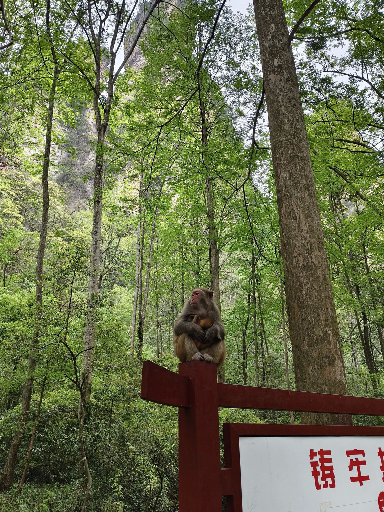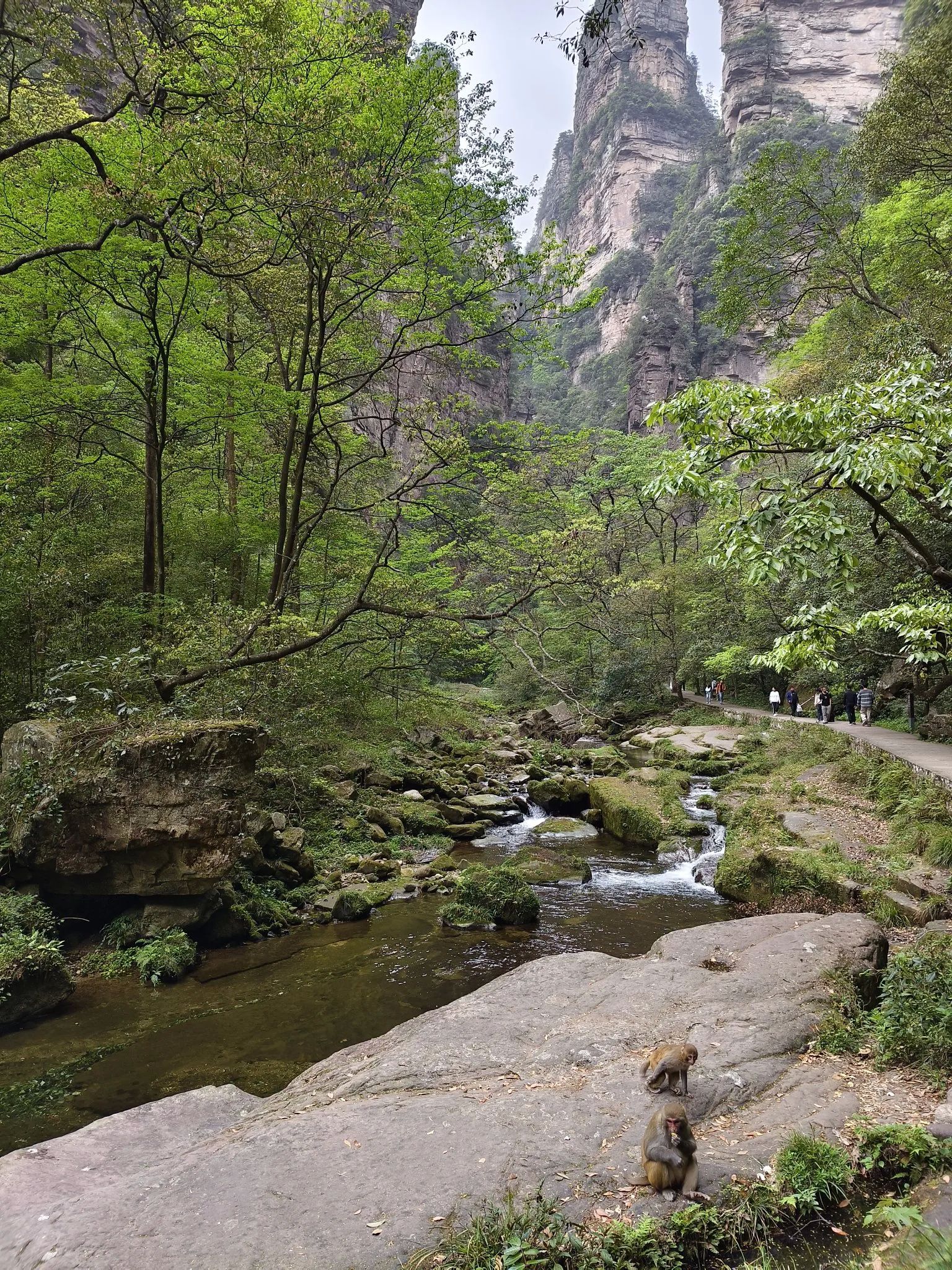第五天,乘网约车到张家界国家森林公园南门,没走多远就看到了大氧吧广场,这里号称是张家界最美景点,抖音上很多张家界的短视频就是这里的场景。坐接驳车到黄石寨索道站,坐索道下山,步行大圈欣赏黄石寨美景,约两个多小时。风景很美,但是头天已经去过袁家界、天子山,这会儿也出现审美疲劳了。索道下山,从大氧吧开始徒步金鞭溪,顺着溪流边的小路下坡,景美且不累,途中有野猴群跟游客乞食,甚至抢夺食物,很有野趣,到四水绕门,全程5.8公里,悠闲散步,耗时约三个小时。坐接驳车回到标志门。