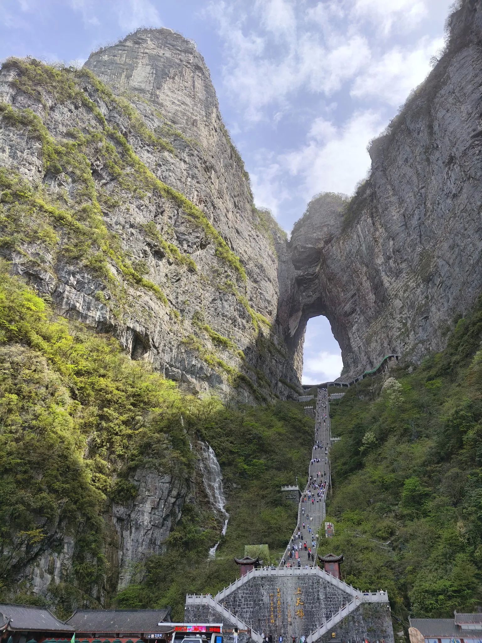 第三天,提前在去哪儿网买了天门山国家森林公园的门票,约了8:00入园,7:45就到了,人不多不需要排队,乘坐号称世界最长的索道(单程耗时28分钟)直达山顶,落差有一千多米,所以山下很热山上有点冷。天门山有东线和西线两个线路,旅行社一般只带游客走东线小圈,我是走完了西线又走了东线,不累,体验感很好,玻璃栈道也值得一走,走完西线后在天门山寺又坐了索道到达云梦仙顶,这也是天门山的最高处,不过上去后风景一般,个人觉得不值得(索道往返50元)。坐穿山扶梯下到天门洞,又坐扶梯到了天门洞广场,这个角度仰望天门洞,特别震撼。在这里坐着吃点东西,刷刷手机,欣赏美景,让人流连忘返。后来乘坐天门洞快线索道、接驳车回到早上出发的天门山索道下站,回酒店拿上行李,乘网约车到了张家界天崇云海度假酒店(武陵源国家森林公园店),这家酒店我在网上预订的时候看到是2025年新装修,实际入住时发现应该不是,有些年头了,酒店房间很多,最大的好处是可以露天晒衣服。在这里连住三晚。服务员很热情,介绍了张家界国家森林公园的旅游路线,购买了套票465元,大概优惠了50块钱吧,4天内进出景区+无限次乘坐百龙天梯、索道、接驳车,个人感觉还是很值得购买。晚上在附近找吃的,有家“开源餐馆”带来了惊喜,主营早餐、米粉和简单炒菜,但是口味不错,不像其他菜馆那么辣,老板娘说她家就是家常菜做法,对于我来说接受度很高。后来连续三天都去她家吃晚饭。