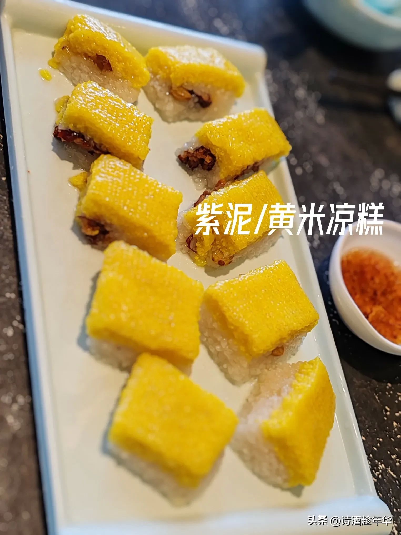 临近中午我们溜达到鼓楼。大同有名的饭店大多在古城里,且大多在鼓楼周围。今天去紫泥吃,还是一如既往的人多,人来人往,环境不错。紫泥是我去年最喜欢的饭馆。但今年我感觉紫泥有点飘呀,您看这个黄米凉糕给我切的歪七扭八,蜜汁也不给淋上。还有这个葫芦鸡是炸的,以前是卤的好吃。这一炸就有预制菜的味道了,不好。后面我们又去了两家别的饭店,超级惊艳,稍后叙述。吃饱喝足就走不动了再加上太阳有点晒,再回民宿歇会。
