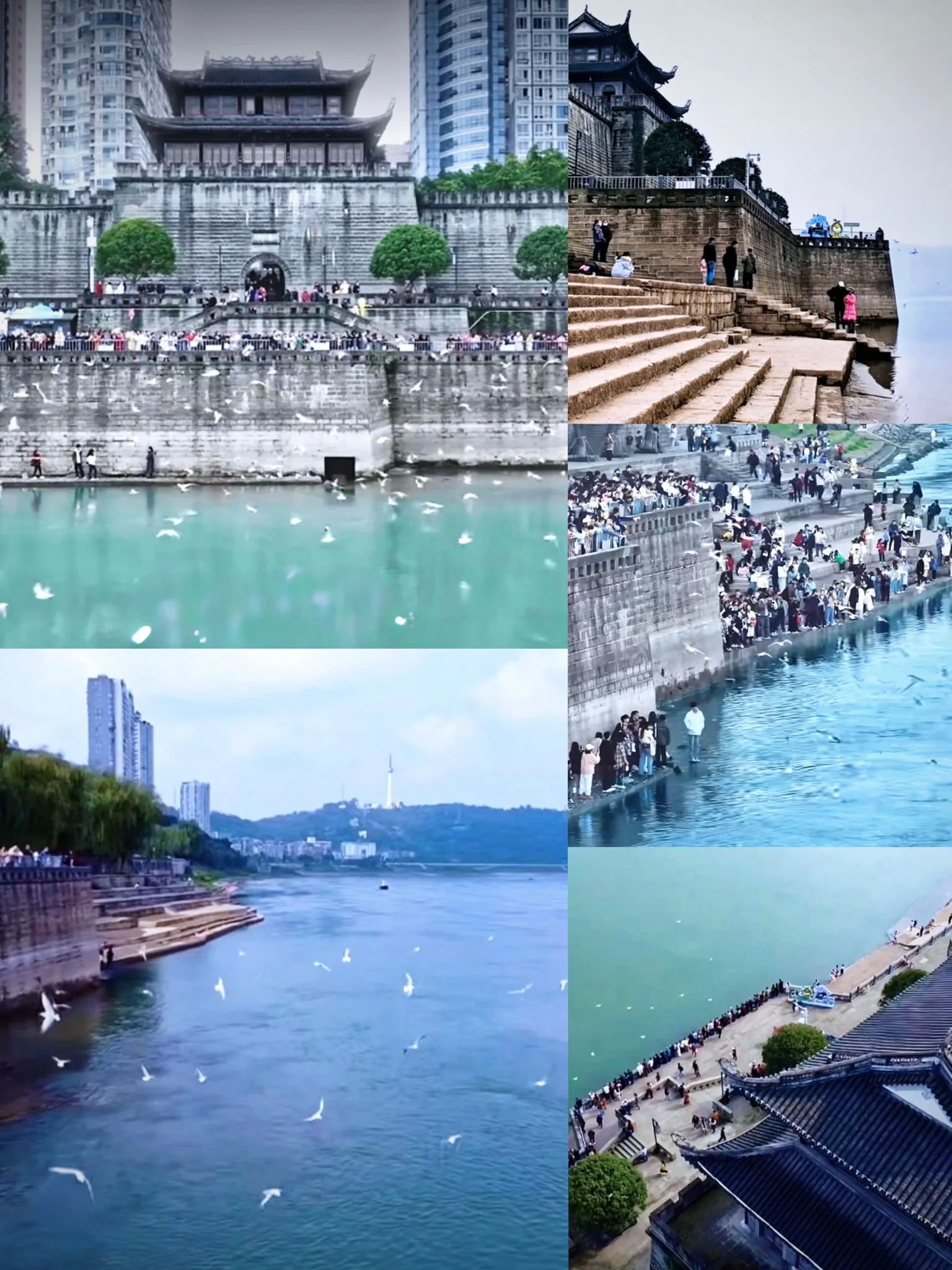 站在城楼上俯瞰,长江里的鱼群嬉戏,两岸江景尽收眼底,这个季节正是观赏西伯利亚红嘴鸥的时节,现场超壮观。