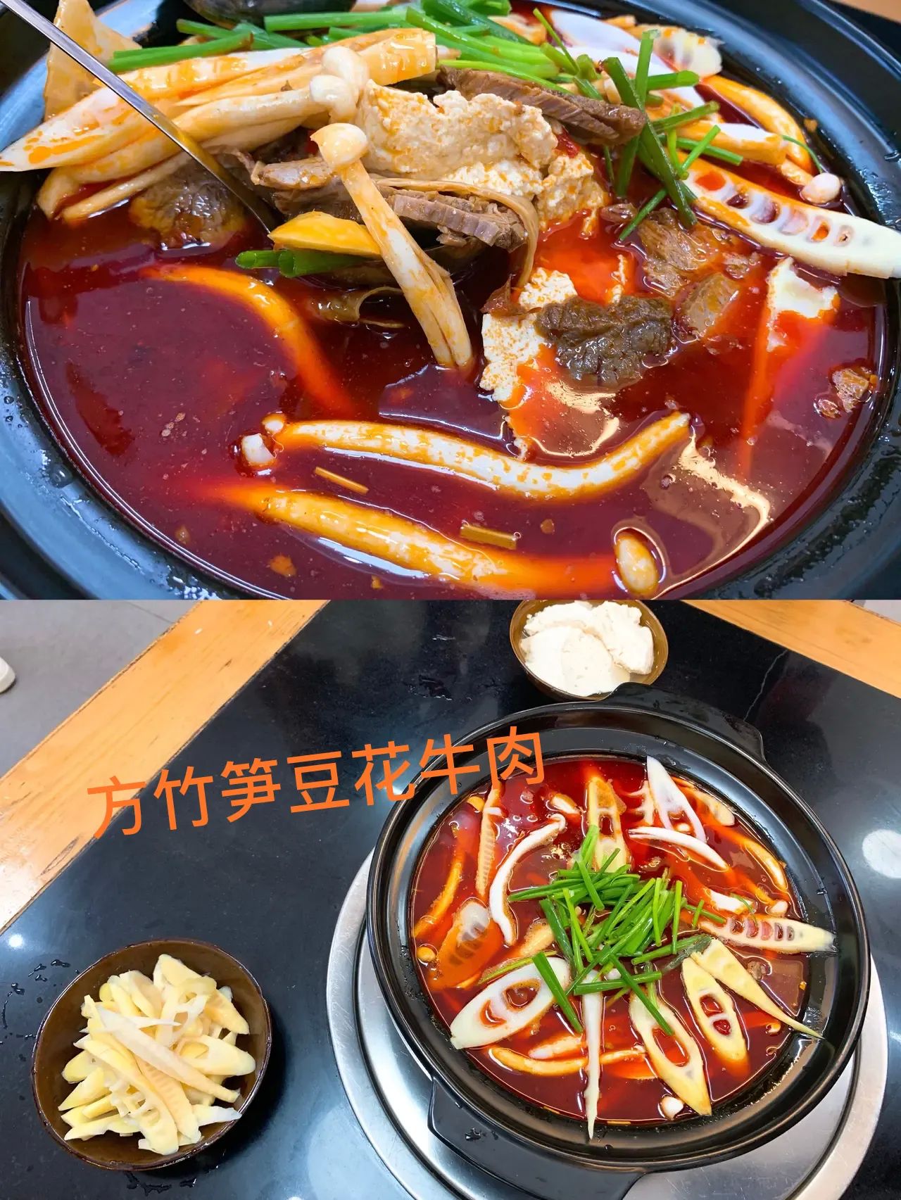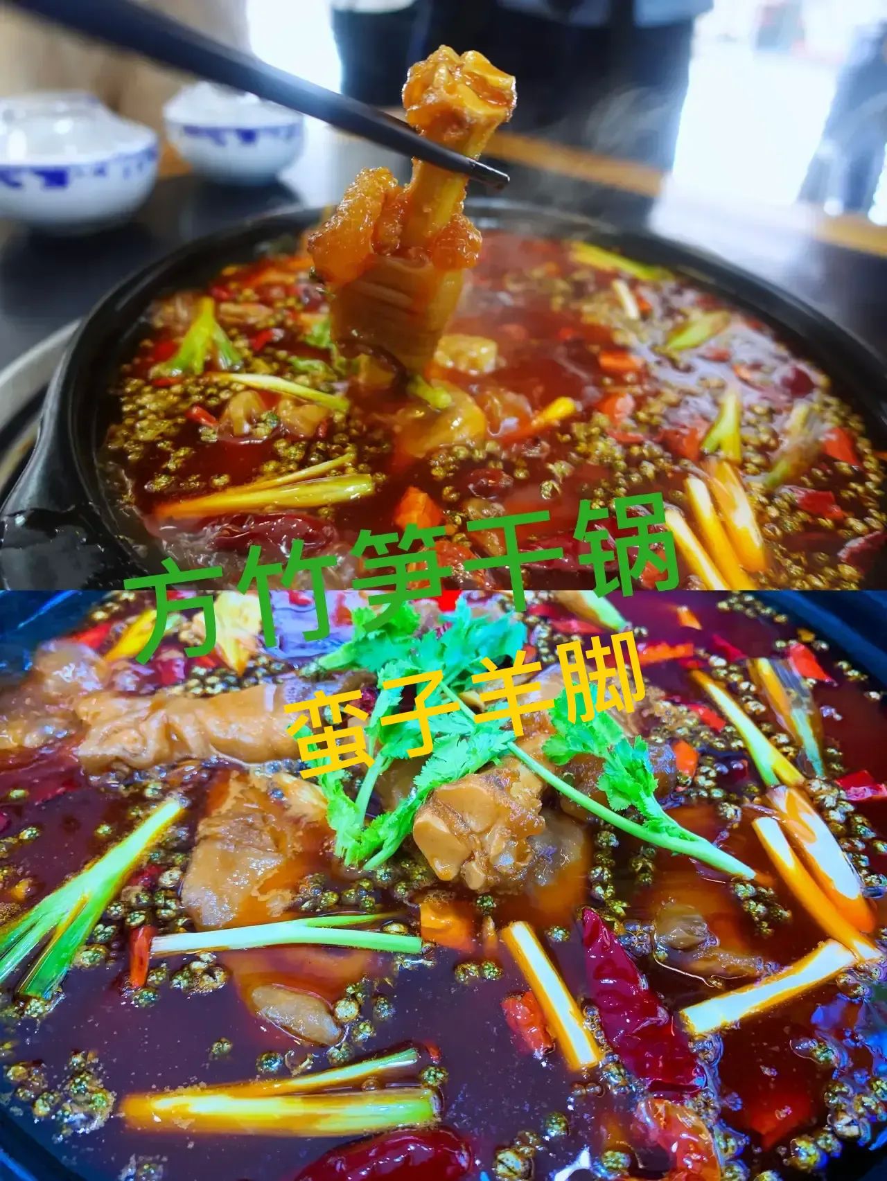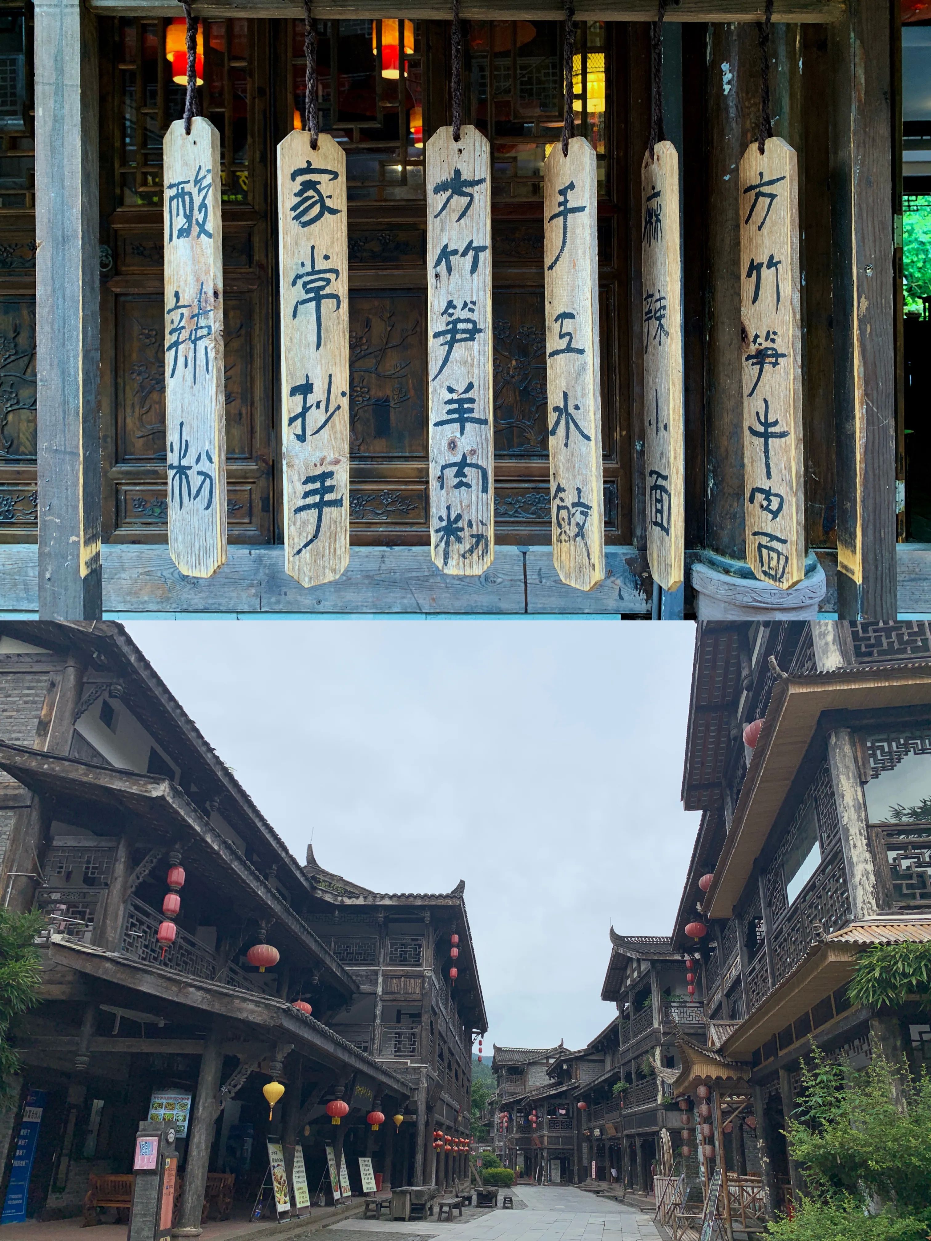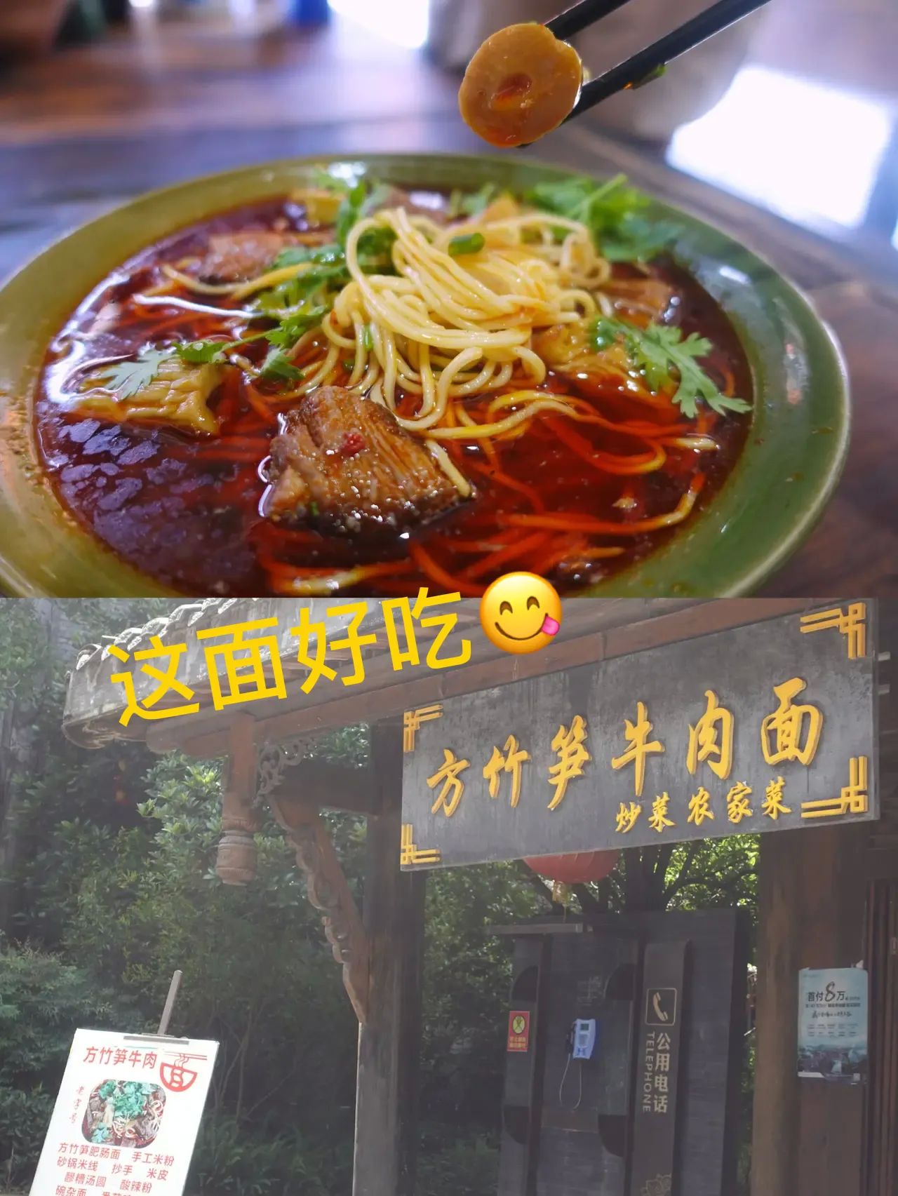 再来说说小镇的美食,方竹笋。感觉方竹笋就像山东煎饼一样,什么食材都可以搭配,比如方竹笋豆花牛肉,方竹笋干锅(蛮子羊脚),锅里的羊脚,超级香。还有方竹笋牛肉面,15元一碗,全竹宴(金佛山菌汤),小锅108元,方竹笋抄手,2两15元,3两20元,反正好吃的太多了……就怪自己早上吃太多![捂脸]